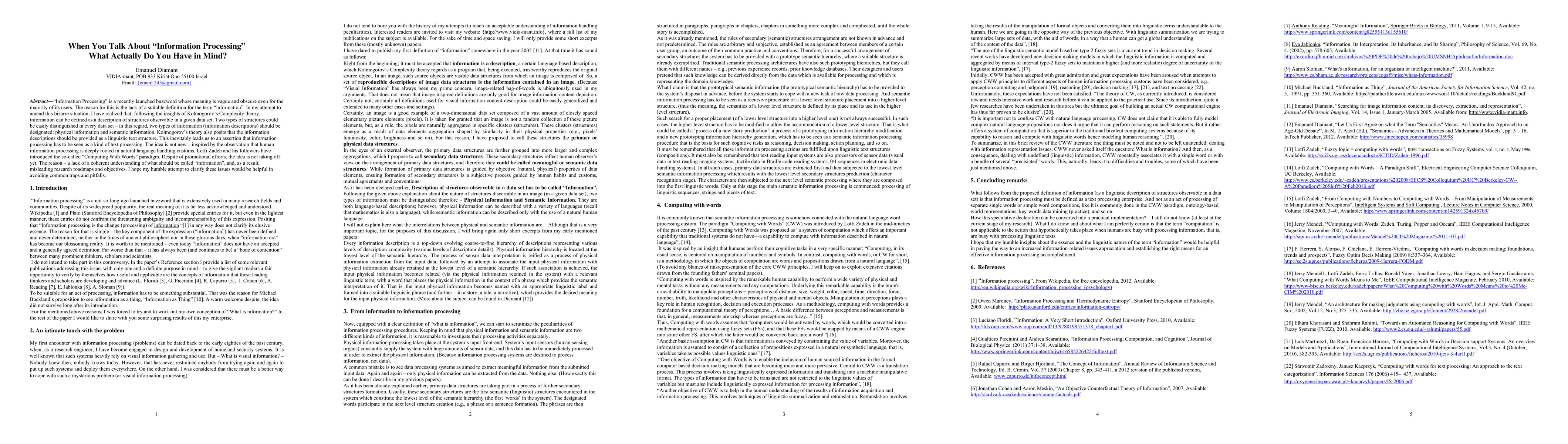 "Information Processing" is a recently launched buzzword whose meaning is vague and obscure even for the majority of its users. The reason for this is the lack of a suitable definition for the term "information". In my attempt to amend this bizarre situation, I have realized that, following the insights of Kolmogorov's Complexity theory, information can be defined as a description of structures observable in a given data set. Two types of structures could be easily distinguished in every data set - in this regard, two types of information (information descriptions) should be designated: physical information and semantic information. Kolmogorov's theory also posits that the information descriptions should be provided as a linguistic text structure. This inevitably leads us to an assertion that information processing has to be seen as a kind of text processing. The idea is not new - inspired by the observation that human information processing is deeply rooted in natural language handling customs, Lotfi Zadeh and his followers have introduced the so-called "Computing With Words" paradigm. Despite of promotional efforts, the idea is not taking off yet. The reason - a lack of a coherent understanding of what should be called "information", and, as a result, misleading research roadmaps and objectives. I hope my humble attempt to clarify these issues would be helpful in avoiding common traps and pitfalls.