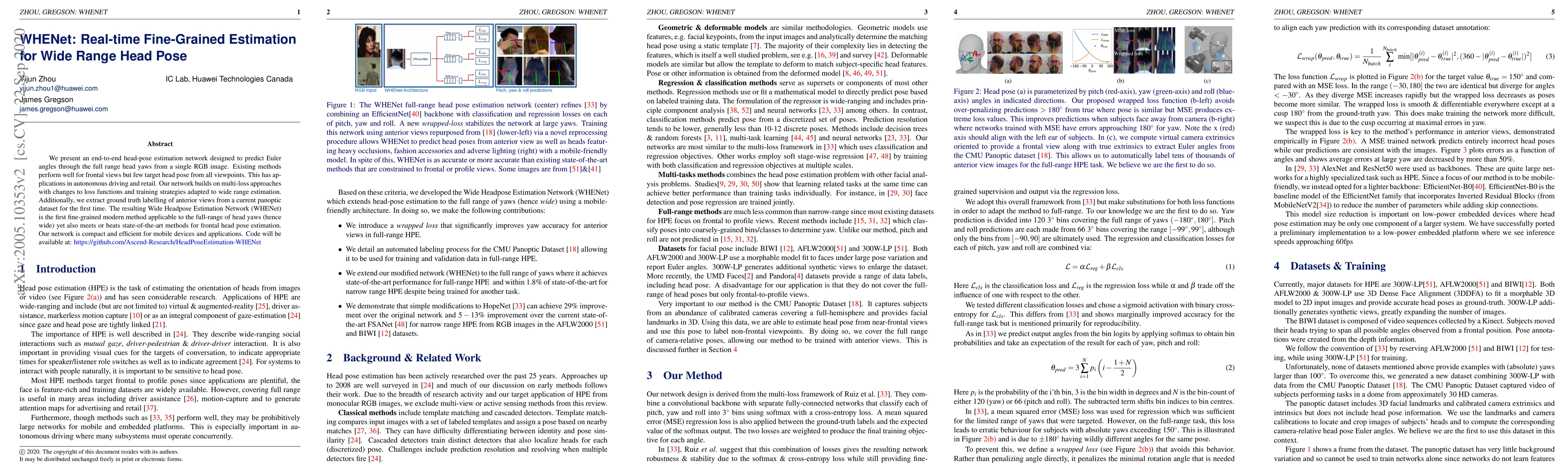 The paper introduces WHENet, a novel head-pose estimation network that effectively handles wide-range head yaws using a wrapped loss function and an automated labeling method for the CMUPanoptic dataset.