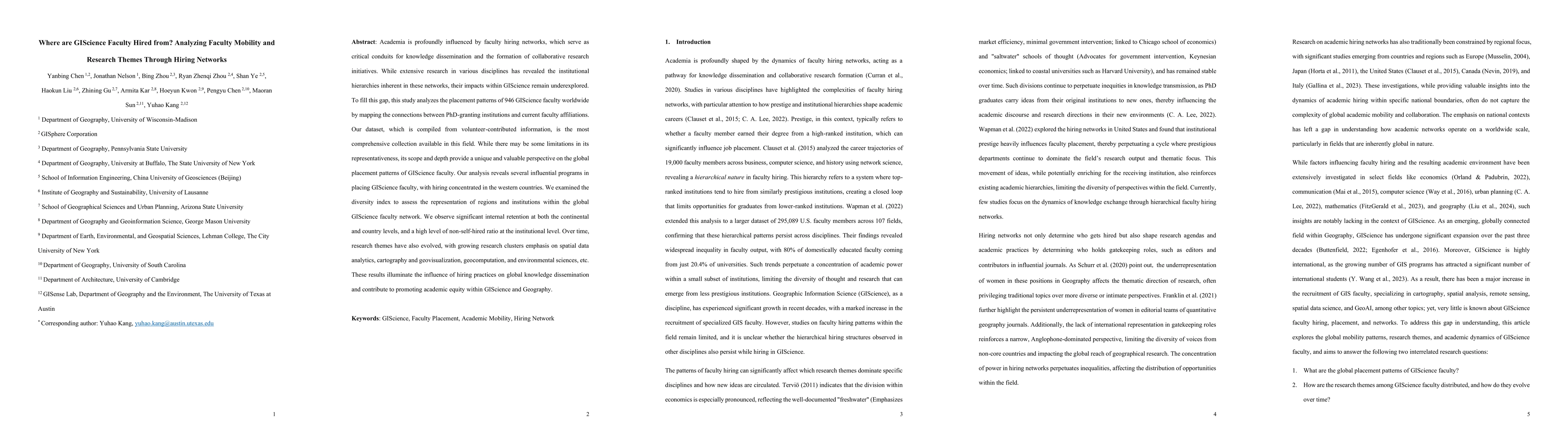 Academia is profoundly influenced by faculty hiring networks, which serve as critical conduits for knowledge dissemination and the formation of collaborative research initiatives. While extensive research in various disciplines has revealed the institutional hierarchies inherent in these networks, their impacts within GIScience remain underexplored. To fill this gap, this study analyzes the placement patterns of 946 GIScience faculty worldwide by mapping the connections between PhD-granting institutions and current faculty affiliations. Our dataset, which is compiled from volunteer-contributed information, is the most comprehensive collection available in this field. While there may be some limitations in its representativeness, its scope and depth provide a unique and valuable perspective on the global placement patterns of GIScience faculty. Our analysis reveals several influential programs in placing GIScience faculty, with hiring concentrated in the western countries. We examined the diversity index to assess the representation of regions and institutions within the global GIScience faculty network. We observe significant internal retention at both the continental and country levels, and a high level of non-self-hired ratio at the institutional level. Over time, research themes have also evolved, with growing research clusters emphasis on spatial data analytics, cartography and geovisualization, geocomputation, and environmental sciences, etc. These results illuminate the influence of hiring practices on global knowledge dissemination and contribute to promoting academic equity within GIScience and Geography.
