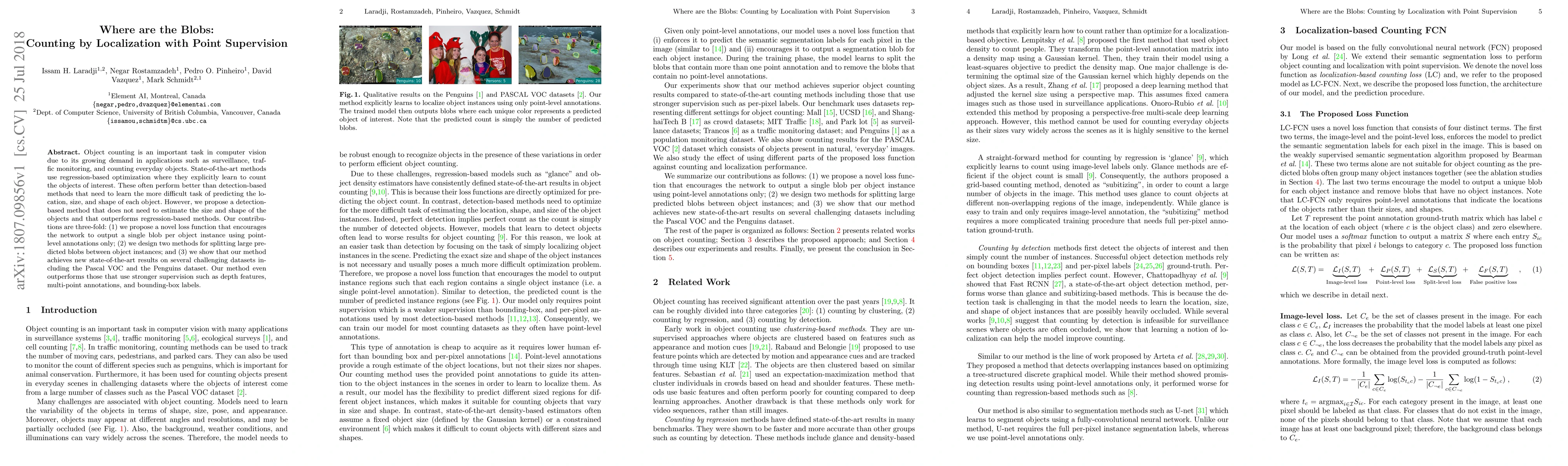 This research introduces a novel detection-based method for object counting, which outperforms regression-based methods without estimating object size and shape. It proposes a unique loss function for single blob output per object instance using point-level annotations, methods for splitting large blobs, and achieves state-of-the-art results on challenging datasets like Pascal VOC and Penguins, even surpassing those with stronger supervision.