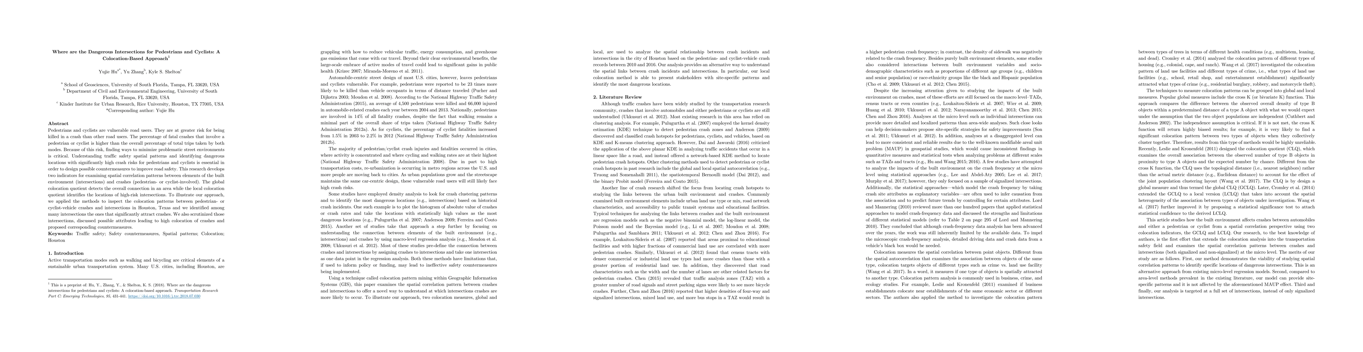 Researchers used a colocation-based approach to identify dangerous intersections for pedestrians and cyclists in Houston, Texas, finding high-risk locations that attract crashes and proposing countermeasures to improve road safety.
