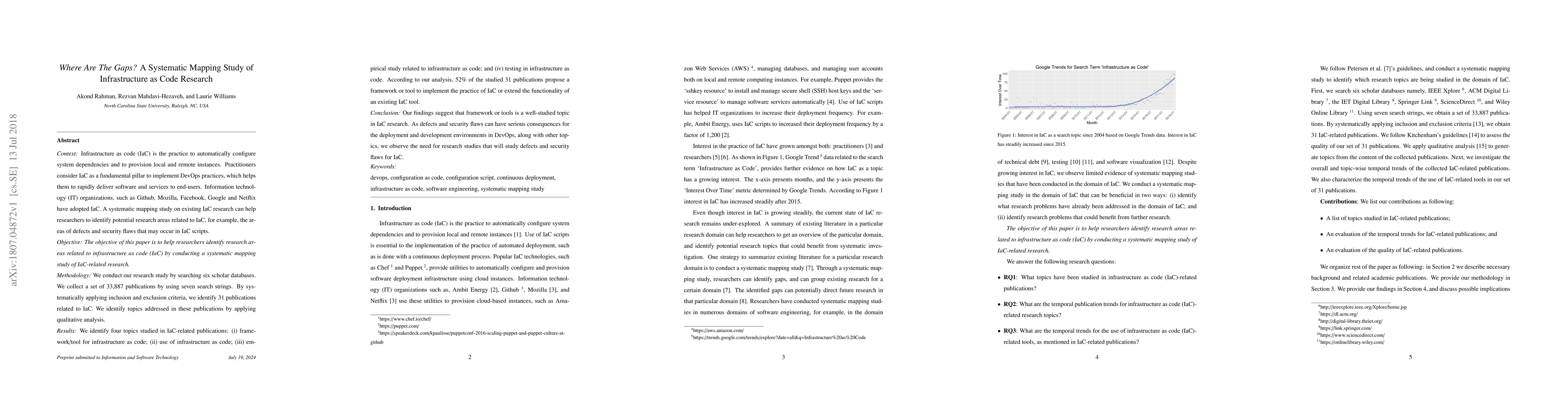 Context:Infrastructure as code (IaC) is the practice to automatically configure system dependencies and to provision local and remote instances. Practitioners consider IaC as a fundamental pillar to implement DevOps practices, which helps them to rapidly deliver software and services to end-users. Information technology (IT) organizations, such as Github, Mozilla, Facebook, Google and Netflix have adopted IaC. A systematic mapping study on existing IaC research can help researchers to identify potential research areas related to IaC, for example, the areas of defects and security flaws that may occur in IaC scripts. Objective: The objective of this paper is to help researchers identify research areas related to infrastructure as code (IaC) by conducting a systematic mapping study of IaC-related research. Methodology: We conduct our research study by searching six scholar databases. We collect a set of 33,887 publications by using seven search strings. By systematically applying inclusion and exclusion criteria, we identify 31 publications related to IaC. We identify topics addressed in these publications by applying qualitative analysis. Results: We identify four topics studied in IaC-related publications: (i) framework/tool for infrastructure as code; (ii) use of infrastructure as code; (iii) empirical study related to infrastructure as code; and (iv) testing in infrastructure as code. According to our analysis, 52% of the studied 31 publications propose a framework or tool to implement the practice of IaC or extend the functionality of an existing IaC tool. Conclusion: As defects and security flaws can have serious consequences for the deployment and development environments in DevOps, along with other topics, we observe the need for research studies that will study defects and security flaws for IaC.