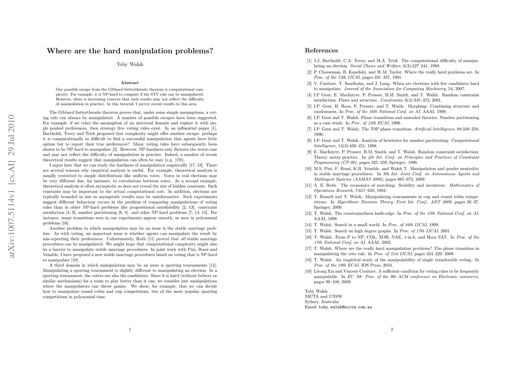 One possible escape from the Gibbard-Satterthwaite theorem is computational complexity. For example, it is NP-hard to compute if the STV rule can be manipulated. However, there is increasing concern that such results may not re ect the difficulty of manipulation in practice. In this tutorial, I survey recent results in this area.