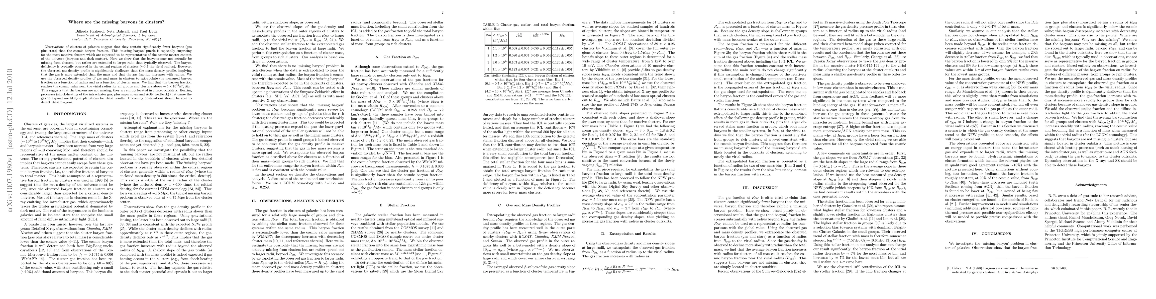 The paper addresses the "missing baryon" problem in galaxy clusters, suggesting that baryons are not missing but are instead located in the extended outskirts of clusters, beyond the typical observation radius. Heating processes likely cause this gas expansion, and future observations may detect these extended baryons.