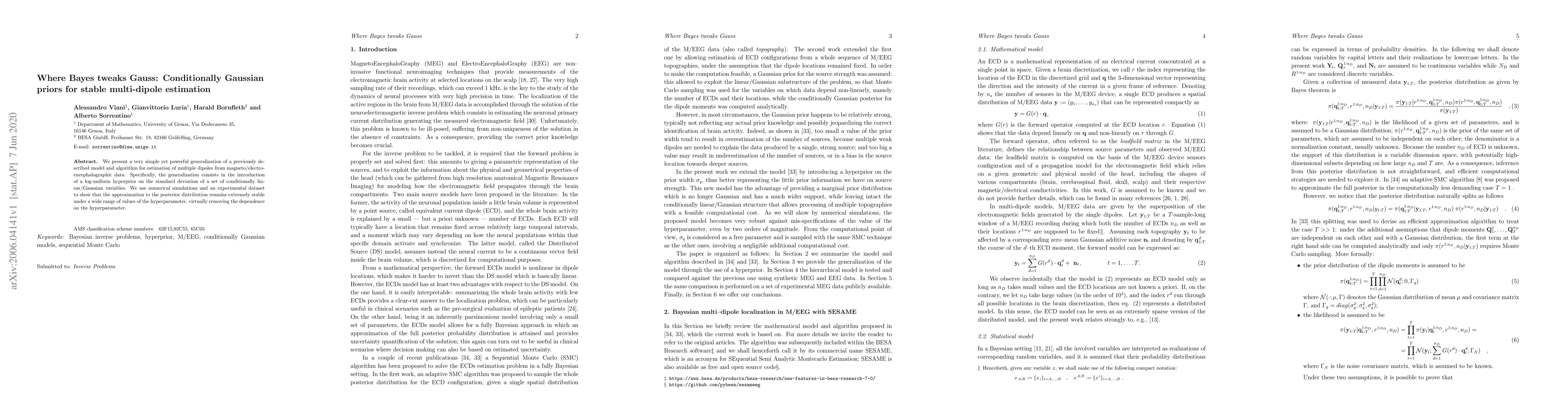 This paper proposes a generalized model for estimating multiple dipoles in magneto/electro-encephalographic data by introducing a log-uniform hyperprior on the standard deviation of conditionally Gaussian variables. The method demonstrates stable posterior approximations across various hyperparameter values, effectively eliminating their influence.