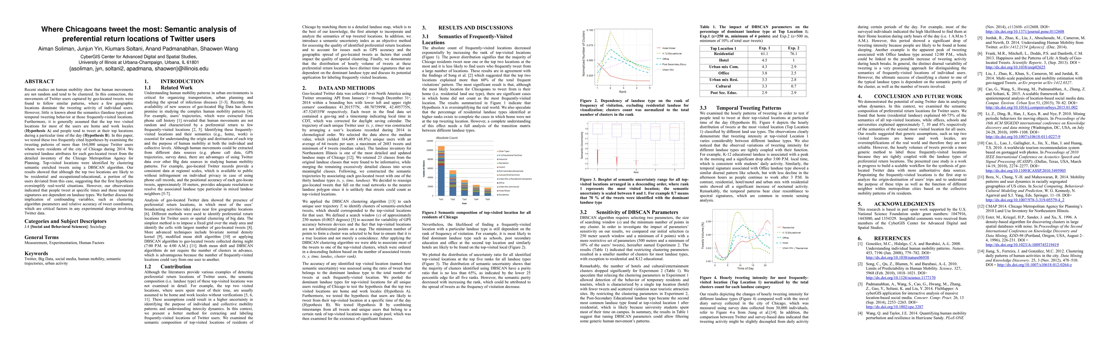 This paper analyzes the tweeting patterns of over 164,000 Chicago Twitter users to explore their preferential return locations, finding that while most frequently visited locations are residential and occupational/educational, some users deviate from this pattern. It also confirms that users tweet at specific times, with these temporal signatures varying by landuse type.