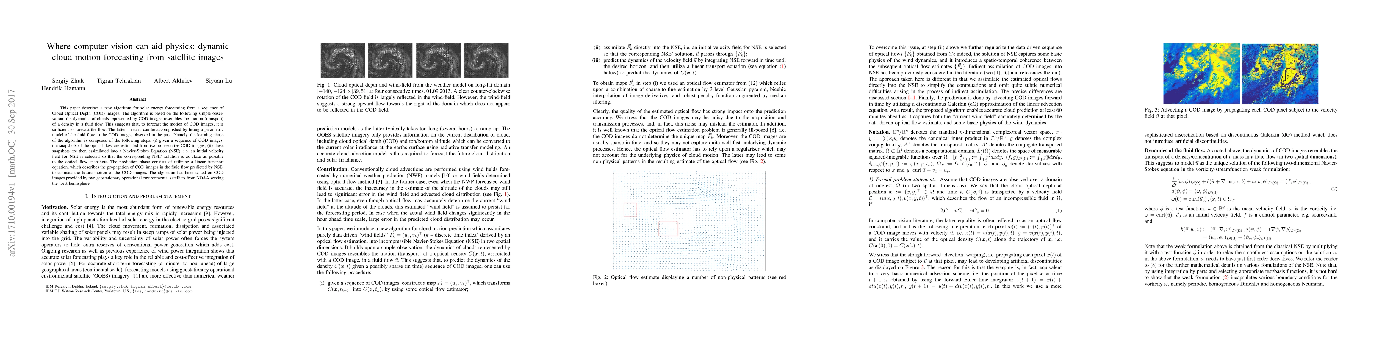 This paper describes a new algorithm for solar energy forecasting from a sequence of Cloud Optical Depth (COD) images. The algorithm is based on the following simple observation: the dynamics of clouds represented by COD images resembles the motion (transport) of a density in a fluid flow. This suggests that, to forecast the motion of COD images, it is sufficient to forecast the flow. The latter, in turn, can be accomplished by fitting a parametric model of the fluid flow to the COD images observed in the past. Namely, the learning phase of the algorithm is composed of the following steps: (i) given a sequence of COD images, the snapshots of the optical flow are estimated from two consecutive COD images; (ii) these snapshots are then assimilated into a Navier-Stokes Equation (NSE), i.e. an initial velocity field for NSE is selected so that the corresponding NSE' solution is as close as possible to the optical flow snapshots. The prediction phase consists of utilizing a linear transport equation, which describes the propagation of COD images in the fluid flow predicted by NSE, to estimate the future motion of the COD images. The algorithm has been tested on COD images provided by two geostationary operational environmental satellites from NOAA serving the west-hemisphere.