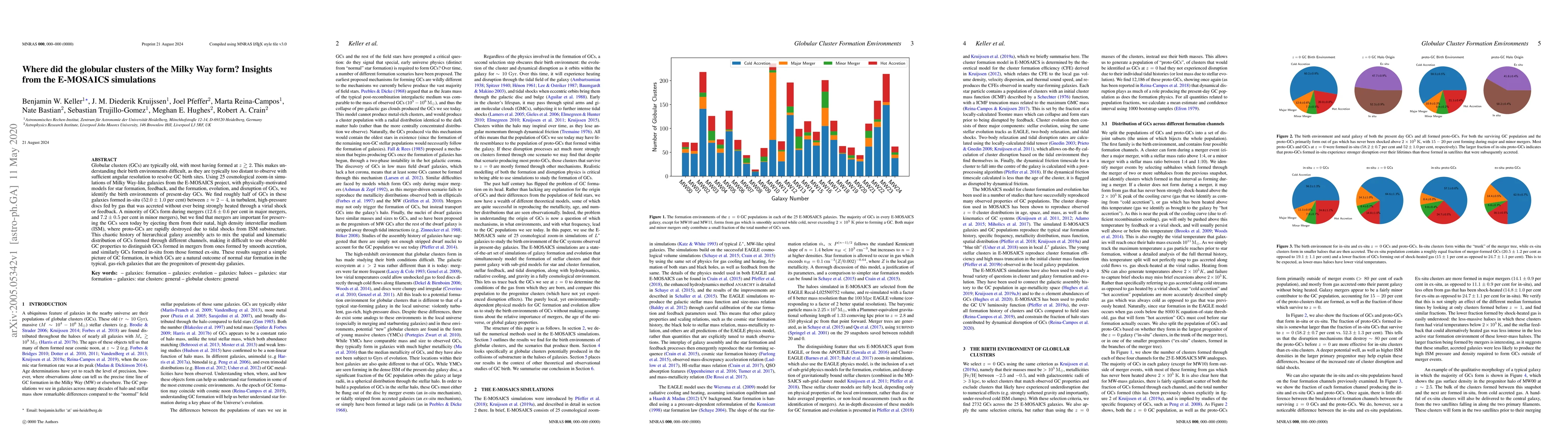 The E-MOSAICS simulations reveal that roughly half of Milky Way's globular clusters formed in-situ in turbulent, high-pressure discs, while the rest formed during galaxy mergers, with mergers playing a crucial role in preserving these clusters by ejecting them from their dense natal environments.