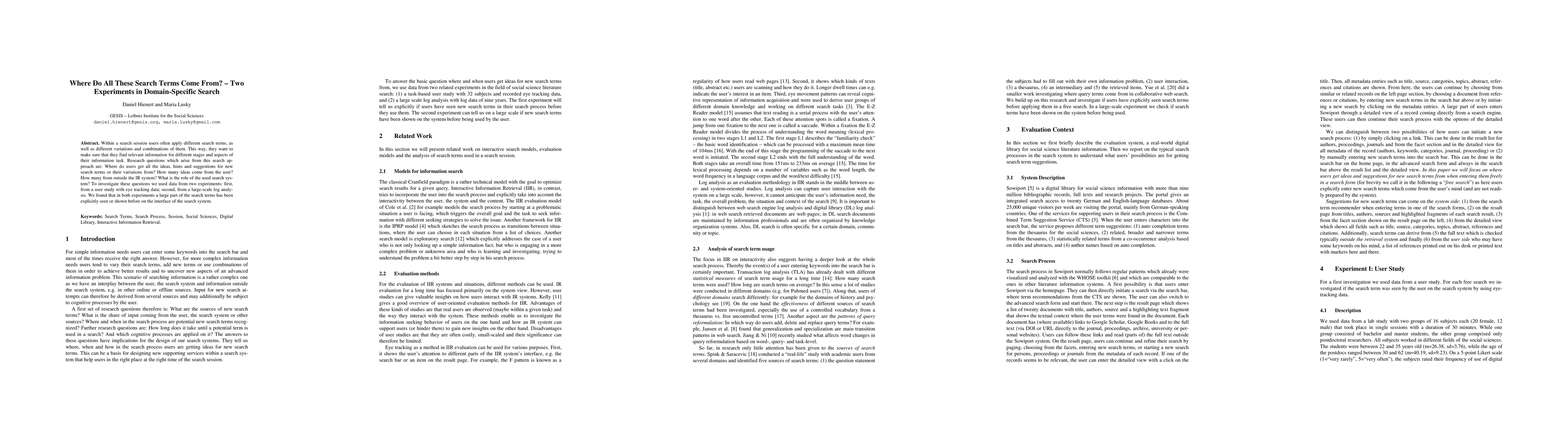 This paper investigates the origins of search terms used by users during domain-specific search sessions, employing data from a user study with eye tracking and a large-scale log analysis. The findings reveal that a significant portion of search terms are derived from suggestions explicitly presented by the search system interface.