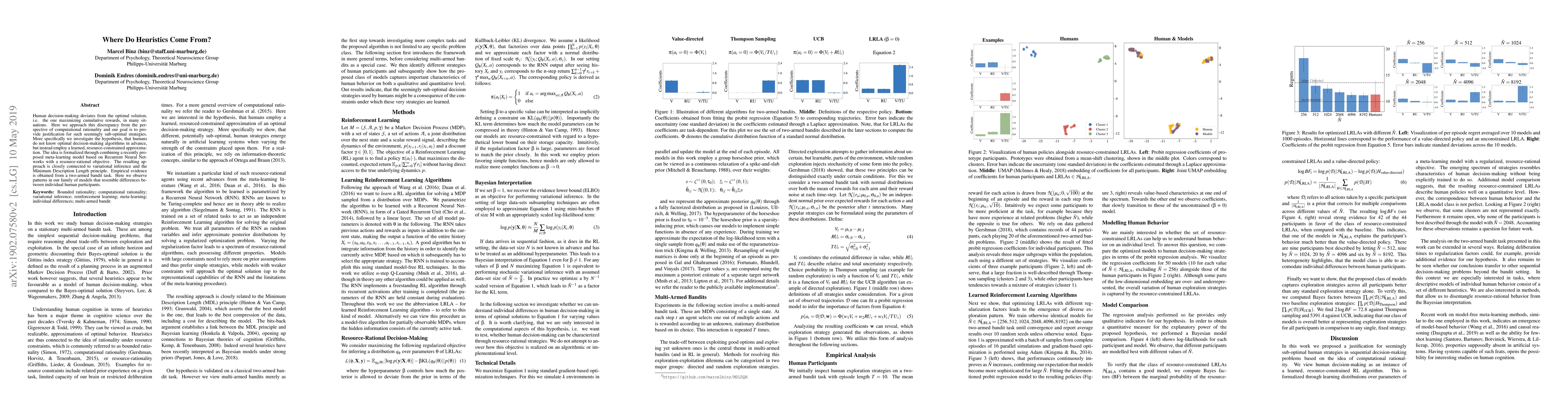 This paper explores how human heuristics arise from bounded rationality, suggesting that humans use learned, resource-constrained approximations rather than optimal decision-making algorithms. The study combines a meta-learning model with a resource-bounded objective and finds similarities between model and human behavior in a two-armed bandit task.