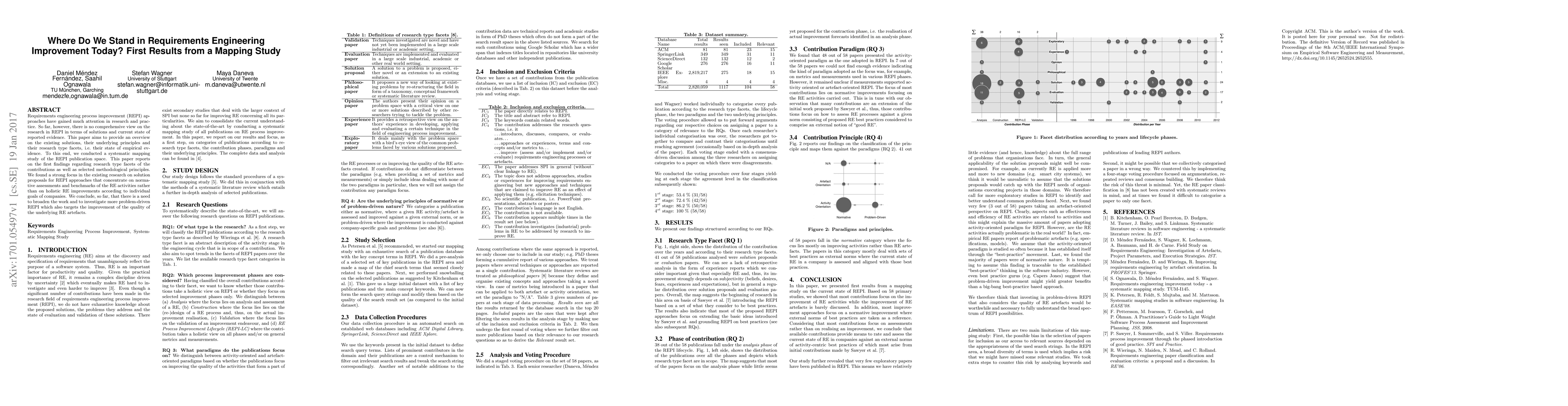 Context: Requirements engineering process improvement (REPI) approaches have gained much attention in research and practice. Goal: So far, there is no comprehensive view on the research in REPI in terms of solutions and current state of reported evidence. We aims to provide an overview on the existing solutions, their underlying principles and their research type facets, i.e. their state of empirical evidence. Method: To this end, we conducted a systematic mapping study of the REPI publication space. Results: This paper reports on the first findings regarding research type facets of the contributions as well as selected methodological principles. We found a strong focus in the existing research on solution proposals for REPI approaches that concentrate on normative assessments and benchmarks of the RE activities rather than on holistic RE improvements according to individual goals of companies. Conclusions: We conclude, so far, that there is a need to broaden the work and to investigate more problem-driven REPI which also targets the improvement of the quality of the underlying RE artefacts, which currently seem out of scope.