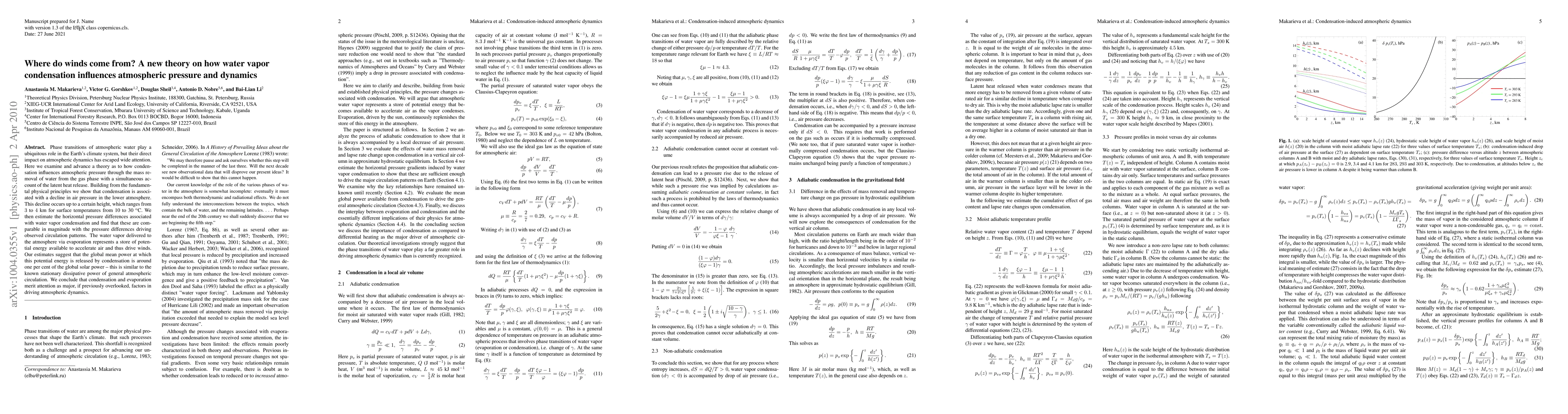 This paper proposes a new theory on how water vapor condensation influences atmospheric pressure and dynamics, showing that condensation leads to a decline in air pressure in the lower atmosphere, contributing to horizontal pressure differences comparable to those driving observed circulation patterns. The study suggests that condensation releases potential energy that can drive winds, accounting for about one percent of global solar power.