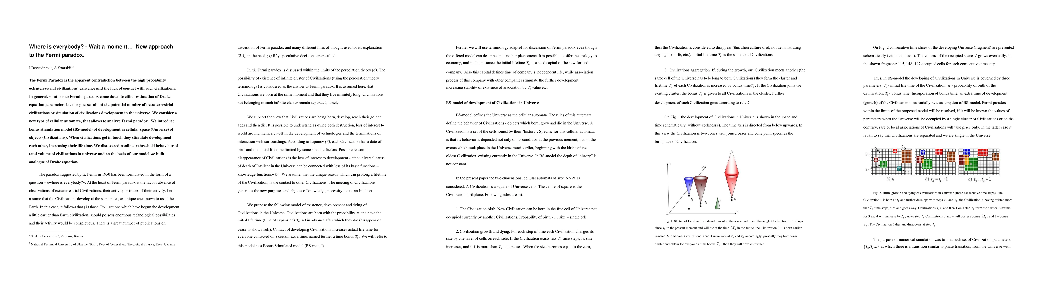 The paper proposes a new cellular automata model to address the Fermi Paradox, introducing a bonus stimulation model where civilizations mutually enhance each other's development, leading to a nonlinear threshold behavior in the total volume of civilizations in the universe. This model provides an alternative approach to the traditional Drake equation.