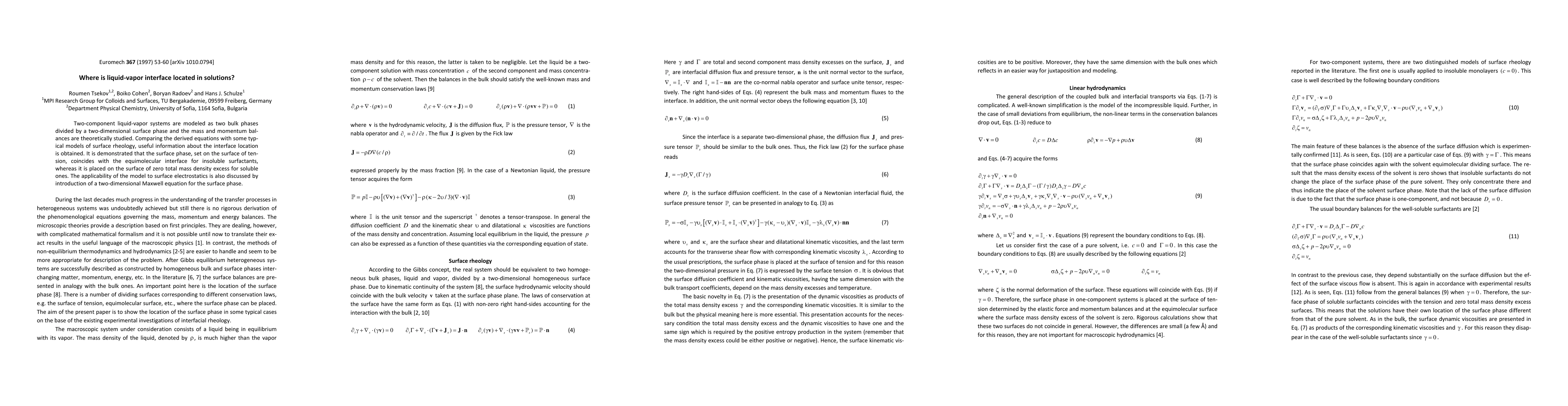 Two-component liquid-vapor systems are modeled as two bulk phases divided by a two-dimensional surface phase and the mass and momentum balances are theoretically studied. Comparing the derived equations with some typical models of surface rheology, useful information about the interface location is obtained. It is demonstrated that the surface phase, set on the surface of tension, coincides with the equimolecular interface for insoluble surfactants, whereas it is placed on the surface of zero total mass density excess for soluble ones. The applicability of the model to surface electrostatics is also discussed by introduction of a two-dimensional Maxwell equation for the surface phase.