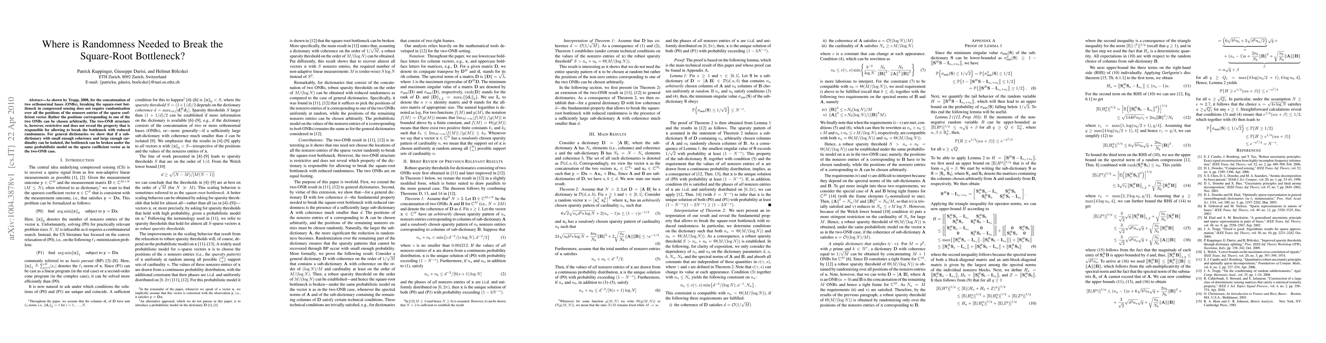 As shown by Tropp, 2008, for the concatenation of two orthonormal bases (ONBs), breaking the square-root bottleneck in compressed sensing does not require randomization over all the positions of the nonzero entries of the sparse coefficient vector. Rather the positions corresponding to one of the two ONBs can be chosen arbitrarily. The two-ONB structure is, however, restrictive and does not reveal the property that is responsible for allowing to break the bottleneck with reduced randomness. For general dictionaries we show that if a sub-dictionary with small enough coherence and large enough cardinality can be isolated, the bottleneck can be broken under the same probabilistic model on the sparse coefficient vector as in the two-ONB case.