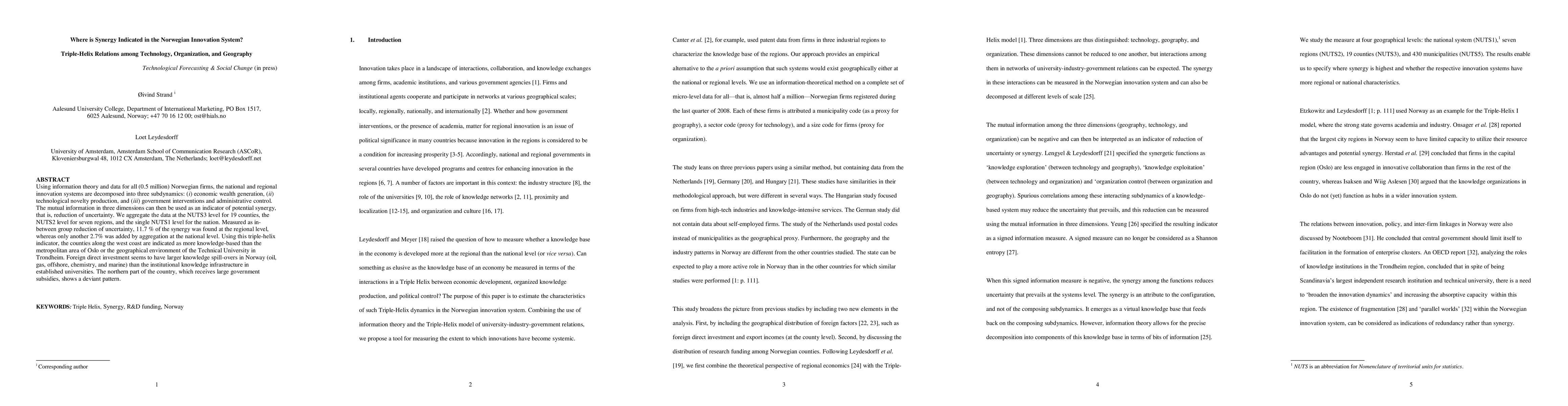 Using information theory and data for all (0.5 million) Norwegian firms, the national and regional innovation systems are decomposed into three subdynamics: (i) economic wealth generation, (ii) technological novelty production, and (iii) government interventions and administrative control. The mutual information in three dimensions can then be used as an indicator of potential synergy, that is, reduction of uncertainty. We aggregate the data at the NUTS3 level for 19 counties, the NUTS2 level for seven regions, and the single NUTS1 level for the nation. Measured as in-between group reduction of uncertainty, 11.7 % of the synergy was found at the regional level, whereas only another 2.7% was added by aggregation at the national level. Using this triple-helix indicator, the counties along the west coast are indicated as more knowledge-based than the metropolitan area of Oslo or the geographical environment of the Technical University in Trondheim. Foreign direct investment seems to have larger knowledge spill-overs in Norway (oil, gas, offshore, chemistry, and marine) than the institutional knowledge infrastructure in established universities. The northern part of the country, which receives large government subsidies, shows a deviant pattern.