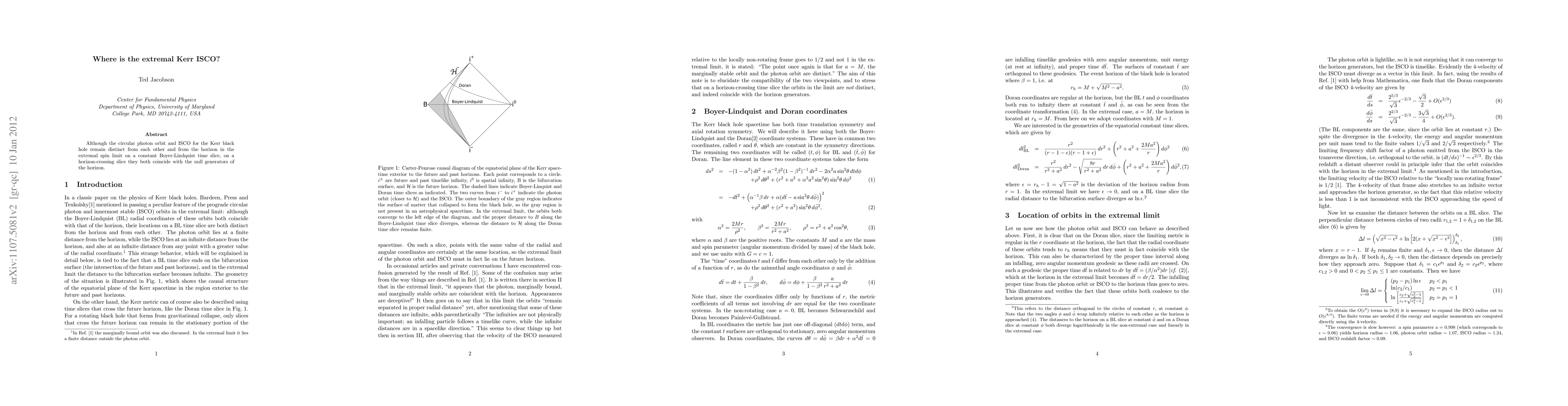 Summary: In the extremal Kerr black hole, the circular photon orbit and innermost stable circular orbit (ISCO) converge with the horizon's null generators on a horizon-crossing slice, despite remaining distinct on a Boyer-Lindquist time slice. This convergence highlights the unique behavior of extremal black holes.