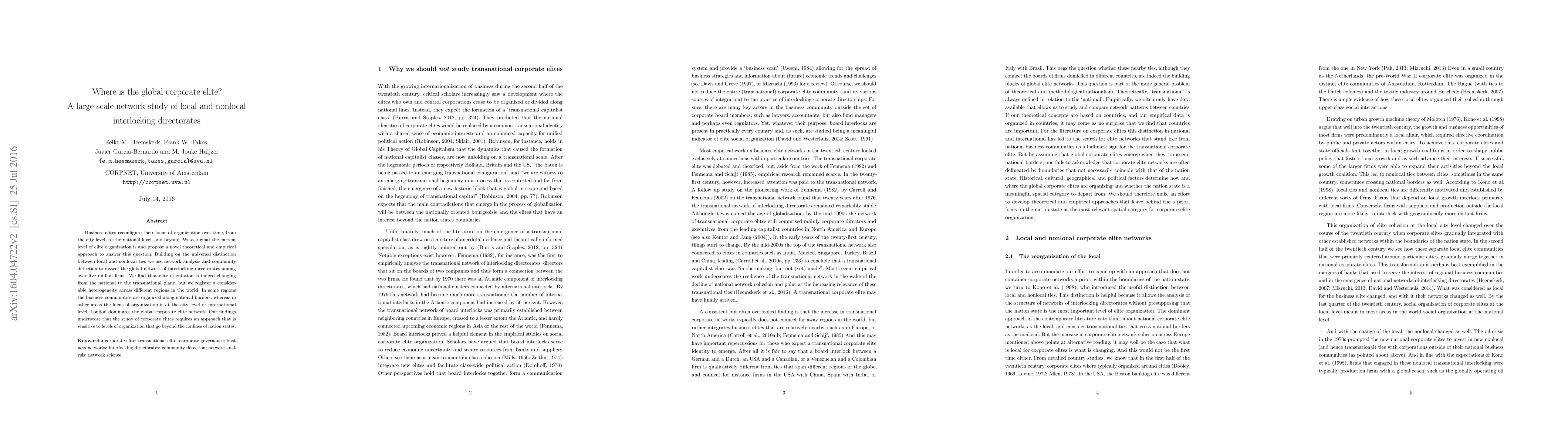 This paper employs network analysis to explore the global corporate elite's organizational structure, revealing a shift from national to transnational levels, with significant regional variations. London emerges as a dominant hub, emphasizing the need for a multi-level approach beyond national borders in studying corporate elites.