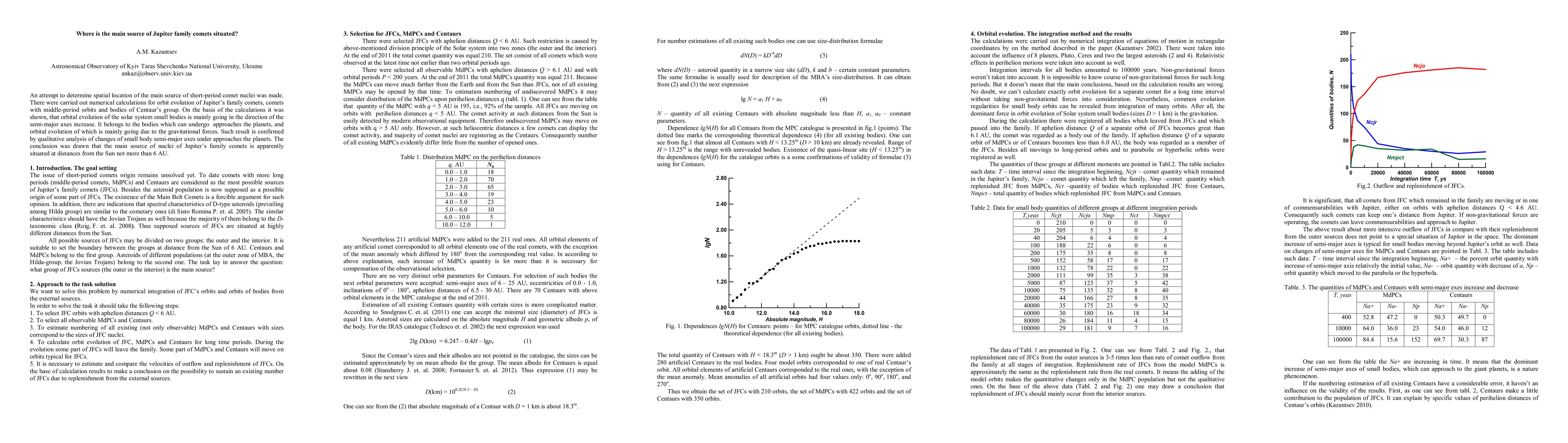 The study concludes that the main source of Jupiter family comets is located at distances from the Sun not exceeding 6 AU, based on numerical calculations of orbit evolution and gravitational influences. This region is identified as the primary origin for short-period comet nuclei.