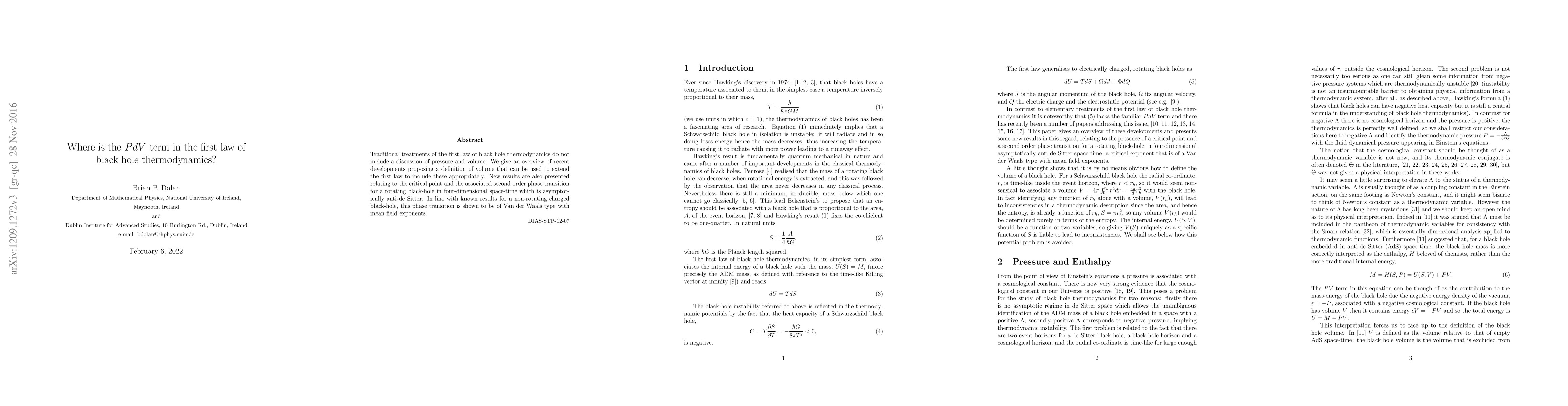 Traditional treatments of the first law of black hole thermodynamics do not include a discussion of pressure and volume. We give an overview of recent developments proposing a definition of volume that can be used to extend the first law to include these appropriately. New results are also presenting relating to the critical point and the associated second order phase transition for a rotating black-hole in four-dimensional space-time which is asymptotically anti-de Sitter. In line with known results for a non-rotating charged black-hole, this phase transition is shown to be of Van der Waals type with mean field exponents.