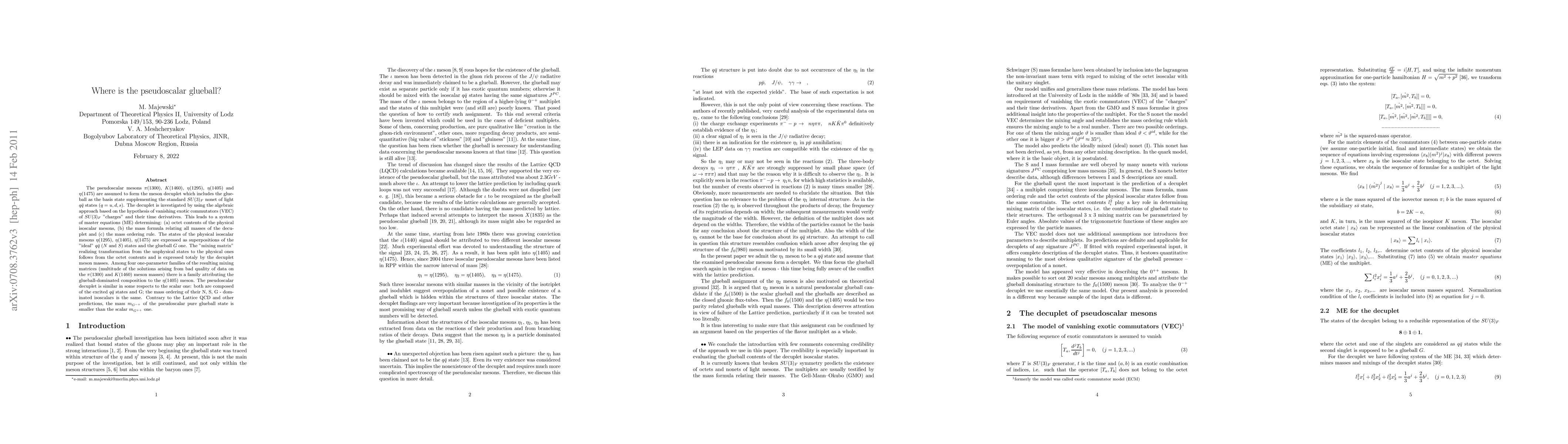 The paper proposes that pseudoscalar mesons heavier than 1 GeV, including the elusive pseudoscalar glueball, form a decuplet alongside standard q\bar{q} states. Using an algebraic approach and commutator restrictions, it suggests the η(1405) is glueball-dominant, noting spectral similarities between pseudoscalar and scalar decuplets and affinity of the glueball with excited q\bar{q} states.
