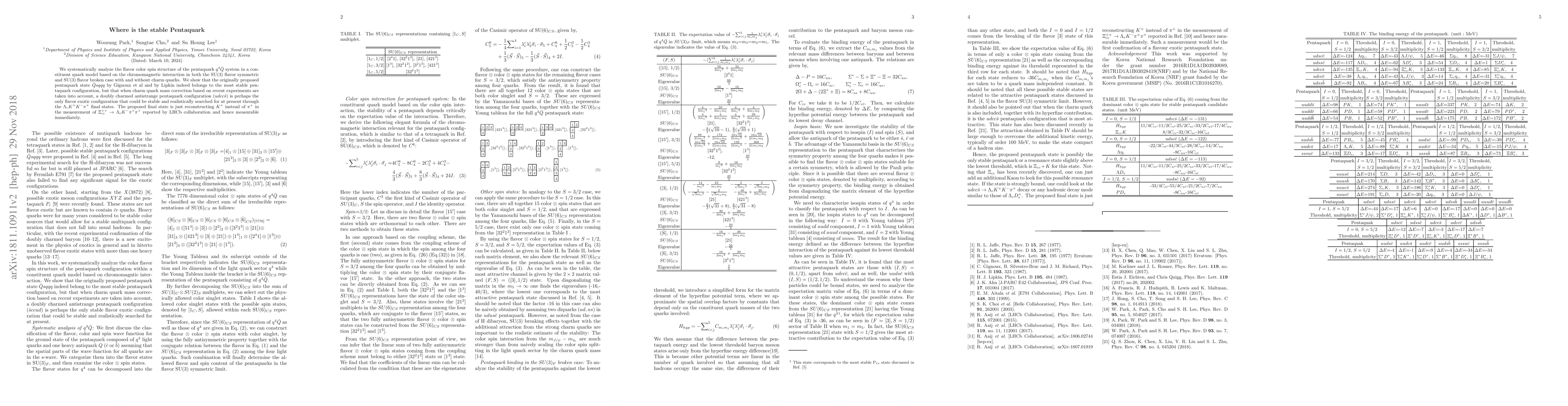 We systematically analyze the flavor color spin structure of the pentaquark $q^4\bar{Q}$ system in a constituent quark model based on the chromomagnetic interaction in both the SU(3) flavor symmetric and SU(3) flavor broken case with and without charm quarks. We show that the originally proposed pentaquark state $\bar{Q}s qqq$ by Gignoux et al and by Lipkin indeed belongs to the most stable pentaquark configuration, but that when charm quark mass correction based on recent experiments are taken into account, a doubly charmed antistrange pentaquark configuration ($udc c \bar{s}$) is perhaps the only flavor exotic configuration that could be stable and realistically searched for at present through the $\Lambda_c K^+ K^- \pi^+$ final states. The proposed final state is just reconstructing $K^+$ instead of $\pi^+$ in the measurement of $\Xi^{++}_{cc} \rightarrow \Lambda_c K^- \pi^+ \pi^+$ reported by LHCb collaboration and hence measurable immediately.