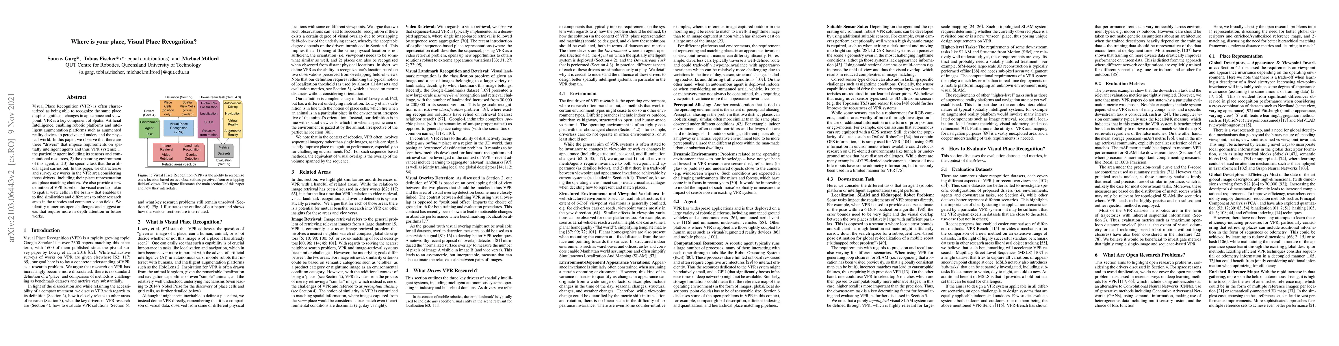 This paper surveys Visual Place Recognition (VPR) systems, emphasizing the influence of agent characteristics, environment, and task on VPR. It proposes a new VPR definition based on visual overlap and highlights open challenges for future research.