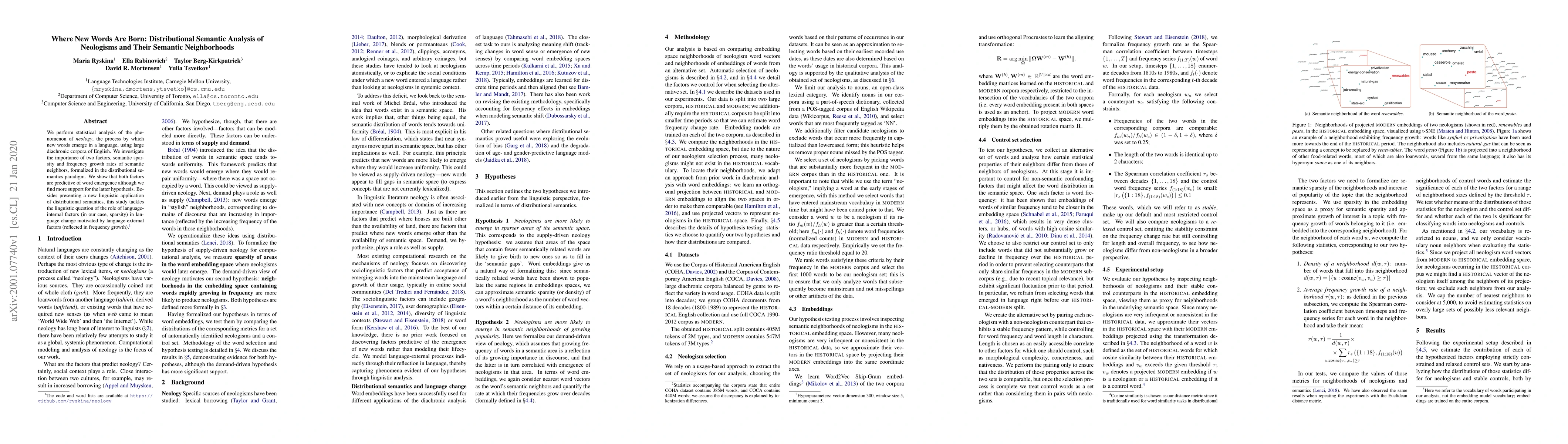 We perform statistical analysis of the phenomenon of neology, the process by which new words emerge in a language, using large diachronic corpora of English. We investigate the importance of two factors, semantic sparsity and frequency growth rates of semantic neighbors, formalized in the distributional semantics paradigm. We show that both factors are predictive of word emergence although we find more support for the latter hypothesis. Besides presenting a new linguistic application of distributional semantics, this study tackles the linguistic question of the role of language-internal factors (in our case, sparsity) in language change motivated by language-external factors (reflected in frequency growth).