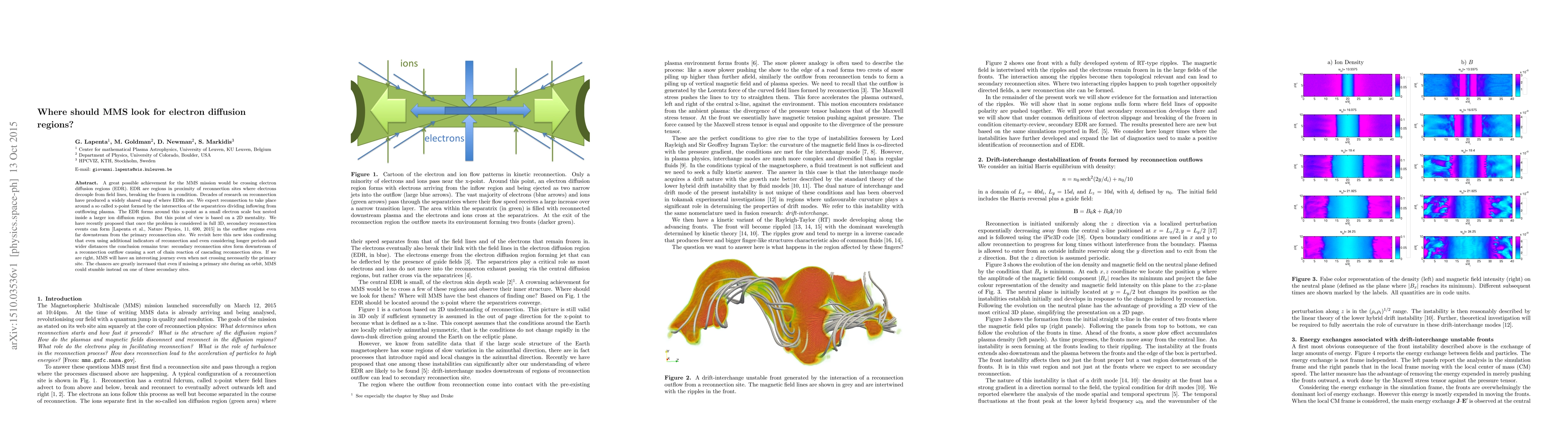 A great possible achievement for the MMS mission would be crossing electron diffusion regions (EDR). EDR are regions in proximity of reconnection sites where electrons decouple from field lines, breaking the frozen in condition. Decades of research on reconnection have produced a widely shared map of where EDRs are. We expect reconnection to take place around a so called x-point formed by the intersection of the separatrices dividing inflowing from outflowing plasma. The EDR forms around this x-point as a small electron scale box nested inside a larger ion diffusion region. But this point of view is based on a 2D mentality. We have recently proposed that once the problem is considered in full 3D, secondary reconnection events can form [Lapenta et al., Nature Physics, 11, 690, 2015] in the outflow regions even far downstream from the primary reconnection site. We revisit here this new idea confirming that even using additional indicators of reconnection and even considering longer periods and wider distances the conclusion remains true: secondary reconnection sites form downstream of a reconnection outflow causing a sort of chain reaction of cascading reconnection sites. If we are right, MMS will have an interesting journey even when not crossing necessarily the primary site. The chances are greatly increased that even if missing a primary site during an orbit, MMS could stumble instead on one of these secondary sites.