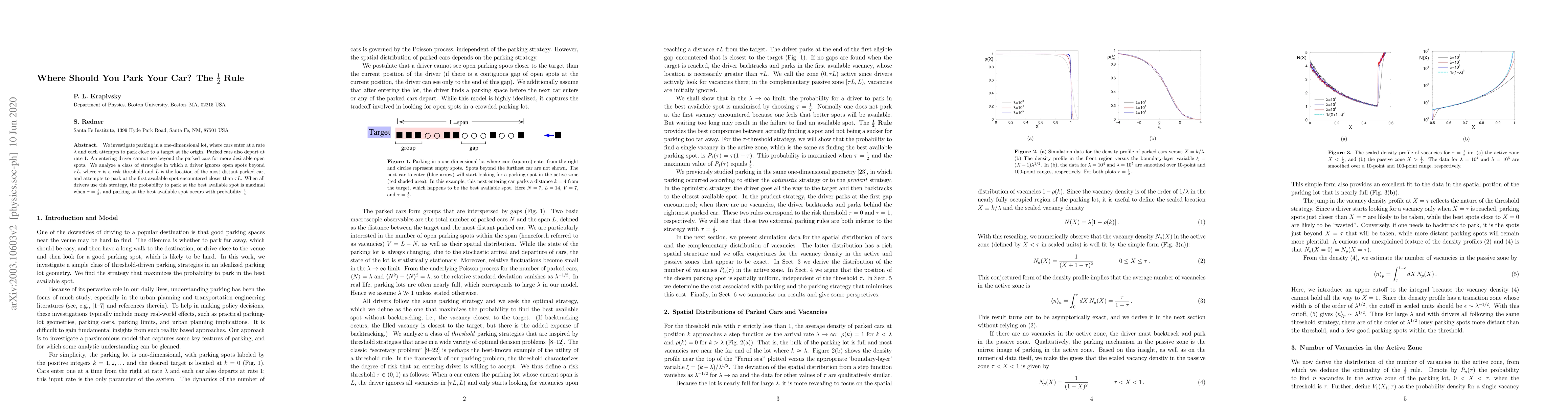 We investigate parking in a one-dimensional lot, where cars enter at a rate $\lambda$ and each attempts to park close to a target at the origin. Parked cars also depart at rate 1. An entering driver cannot see beyond the parked cars for more desirable open spots. We analyze a class of strategies in which a driver ignores open spots beyond $\tau L$, where $\tau$ is a risk threshold and $L$ is the location of the most distant parked car, and attempts to park at the first available spot encountered closer than $\tau L$. When all drivers use this strategy, the probability to park at the best available spot is maximal when $\tau=\frac{1}{2}$, and parking at the best available spot occurs with probability $\frac{1}{4}$.