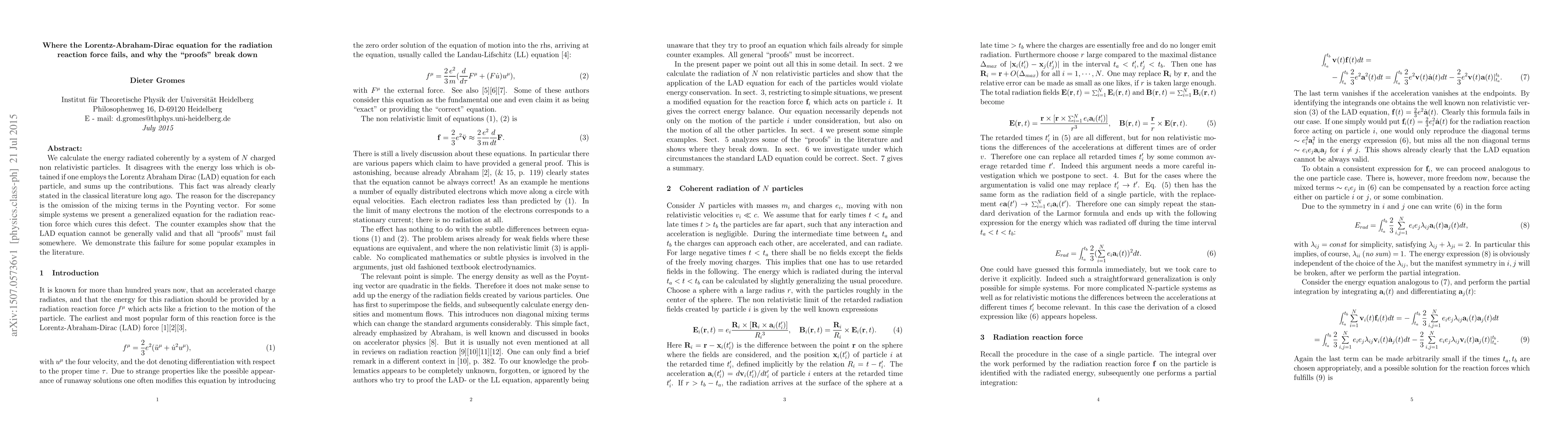 We calculate the energy radiated coherently by a system of $N$ charged non relativistic particles. It disagrees with the energy loss which is obtained if one employs the Lorentz Abraham Dirac (LAD) equation for each particle, and sums up the contributions. This fact was already clearly stated in the classical literature long ago. The reason for the discrepancy is the omission of the mixing terms in the Poynting vector. For some simple systems we present a generalized equation for the radiation reaction force which cures this defect. The counter examples show that the LAD equation cannot be generally valid and that all "proofs" must fail somewhere. We demonstrate this failure for some popular examples in the literature.