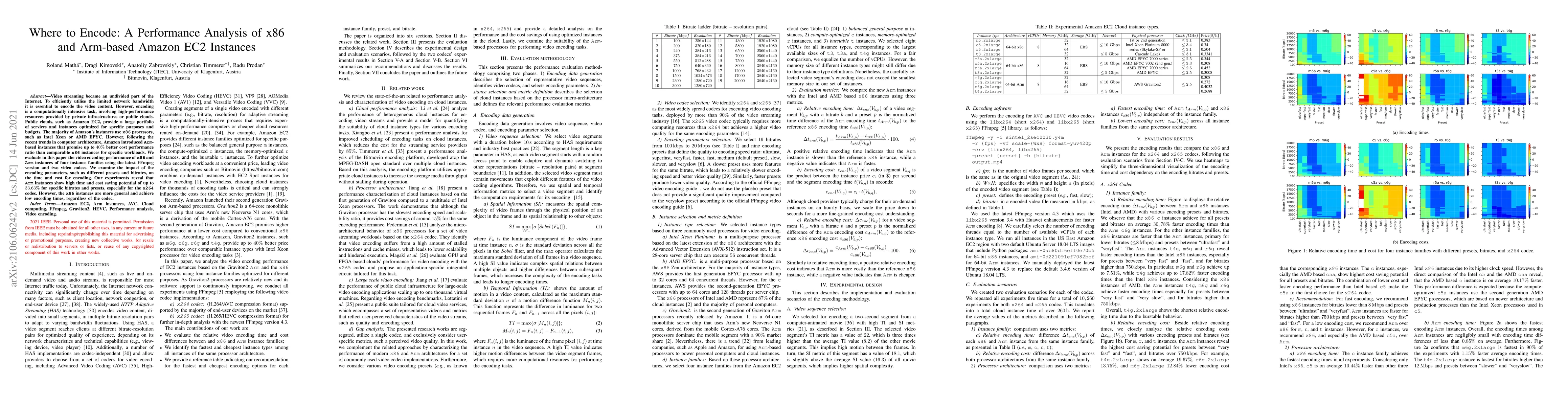 This paper evaluates the performance of video encoding on x86 and Arm-based Amazon EC2 instances, finding that Arm instances offer up to 33.63% better time and cost efficiency for specific encoding parameters, particularly with the x264 codec, while x86 instances provide more general low encoding times.
