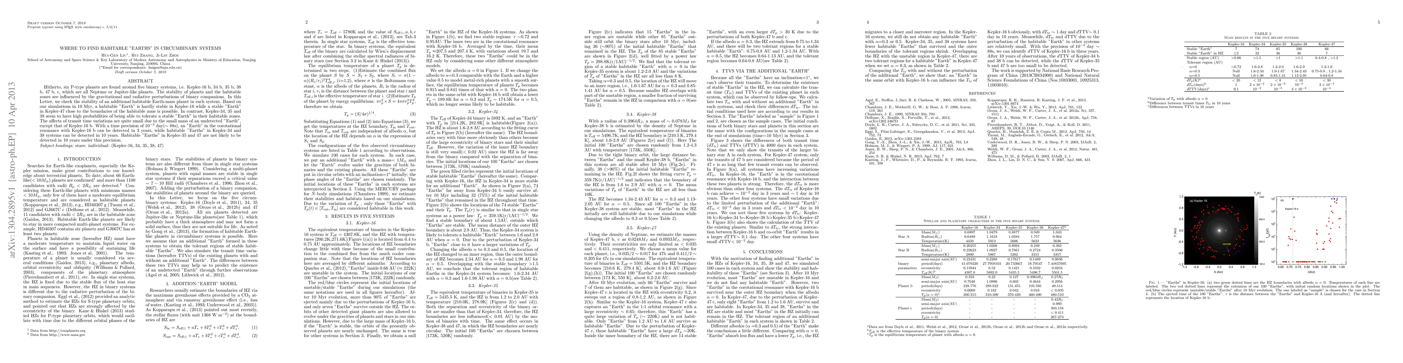 Hitherto, six P-type planets are found around five binary systems, i.e. Kepler-16 b, 34 b, 35 b, 38 b, 47 b, c, which are all Neptune or Jupiter-like planets. The stability of planets and the habitable zones are influenced by the gravitational and radiative perturbations of binary companions. In this Letter, we check the stability of an additional habitable Earth-mass planet in each system. Based on our simulations in 10 Myr, a habitable "Earth" is hardly stable in Kepler-16 while a stable "Earth" in Kepler-47 close to the boundaries of the habitable zone is possible. In contrast, Kepler-34, 35 and 38 seem to have high probabilities of being able to tolerate a stable "Earth" in their habitable zones. The affects of transit time variations are quite small due to the small mass of an undetected "Earth", except that of Kepler-16 b. With a time precision of 0.001 day(~ 88 s), an "Earth" in the corotational resonance with Kepler-16 b can be detected in 3 years, while habitable "Earths" in Kepler-34 and 38 systems can be detected in 10 years. Habitable "Earths" in Kepler-35 and 47 are not likely to be detected in 10 years under this precision.