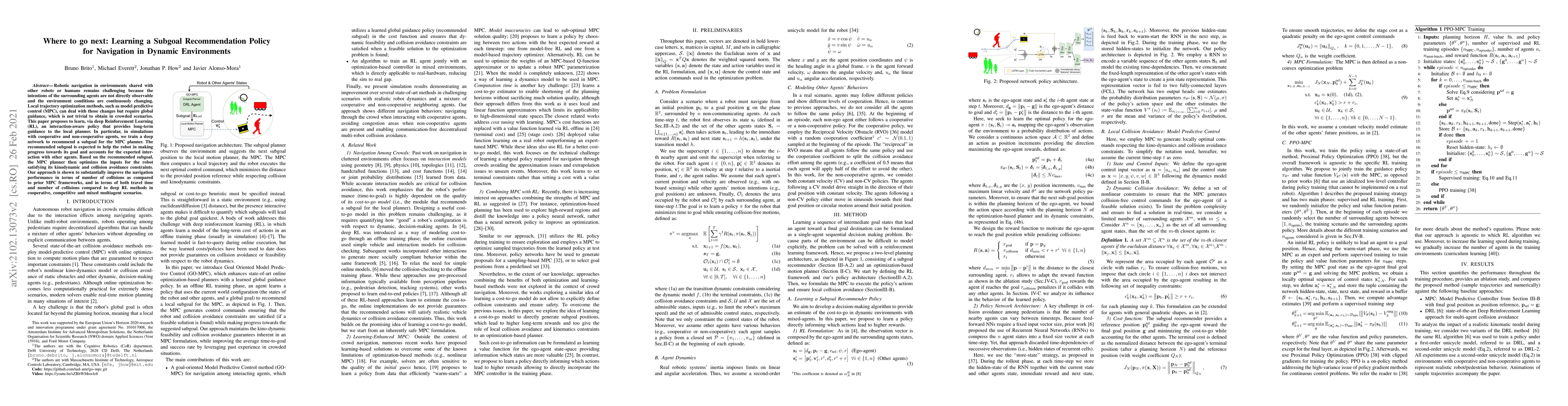 Robotic navigation in environments shared with other robots or humans remains challenging because the intentions of the surrounding agents are not directly observable and the environment conditions are continuously changing. Local trajectory optimization methods, such as model predictive control (MPC), can deal with those changes but require global guidance, which is not trivial to obtain in crowded scenarios. This paper proposes to learn, via deep Reinforcement Learning (RL), an interaction-aware policy that provides long-term guidance to the local planner. In particular, in simulations with cooperative and non-cooperative agents, we train a deep network to recommend a subgoal for the MPC planner. The recommended subgoal is expected to help the robot in making progress towards its goal and accounts for the expected interaction with other agents. Based on the recommended subgoal, the MPC planner then optimizes the inputs for the robot satisfying its kinodynamic and collision avoidance constraints. Our approach is shown to substantially improve the navigation performance in terms of number of collisions as compared to prior MPC frameworks, and in terms of both travel time and number of collisions compared to deep RL methods in cooperative, competitive and mixed multiagent scenarios.