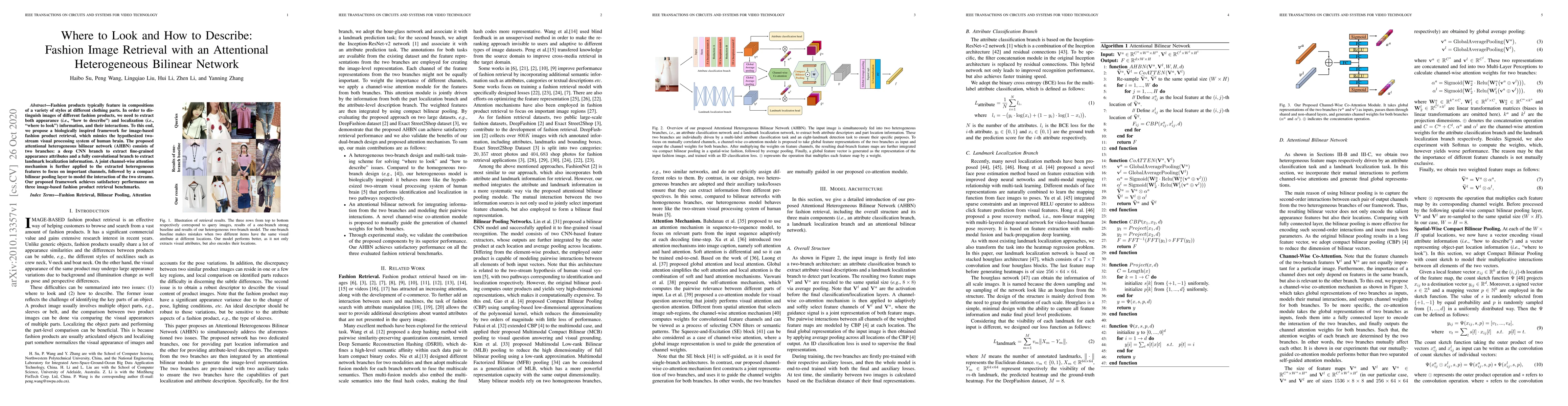 This research introduces an attentional heterogeneous bilinear network (AHBN) for fashion image retrieval, inspired by the human brain's visual processing system. The AHBN extracts appearance and localization features using a deep CNN and a fully convolutional branch, then uses a joint channel-wise attention mechanism and bilinear pooling to model their interaction, achieving good performance on fashion product benchmarks.