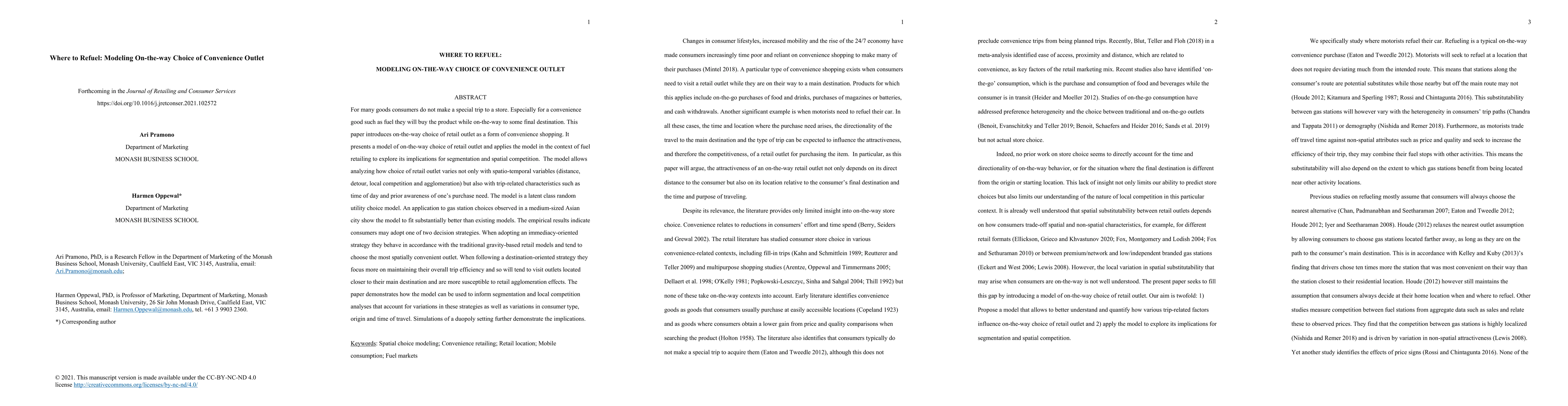 This paper introduces on-the-way choice of retail outlet as a form of convenience shopping. It presents a model of on-the-way choice of retail outlet and applies the model in the context of fuel retailing to explore its implications for segmentation and spatial competition. The model is a latent class random utility choice model. An application to gas station choices observed in a medium-sized Asian city show the model to fit substantially better than existing models. The empirical results indicate consumers may adopt one of two decision strategies. When adopting an immediacy-oriented strategy they behave in accordance with the traditional gravity-based retail models and tend to choose the most spatially convenient outlet. When following a destination-oriented strategy they focus more on maintaining their overall trip efficiency and so will tend to visit outlets located closer to their main destination and are more susceptible to retail agglomeration effects. The paper demonstrates how the model can be used to inform segmentation and local competition analyses that account for variations in these strategies as well as variations in consumer type, origin and time of travel. Simulations of a duopoly setting further demonstrate the implications.