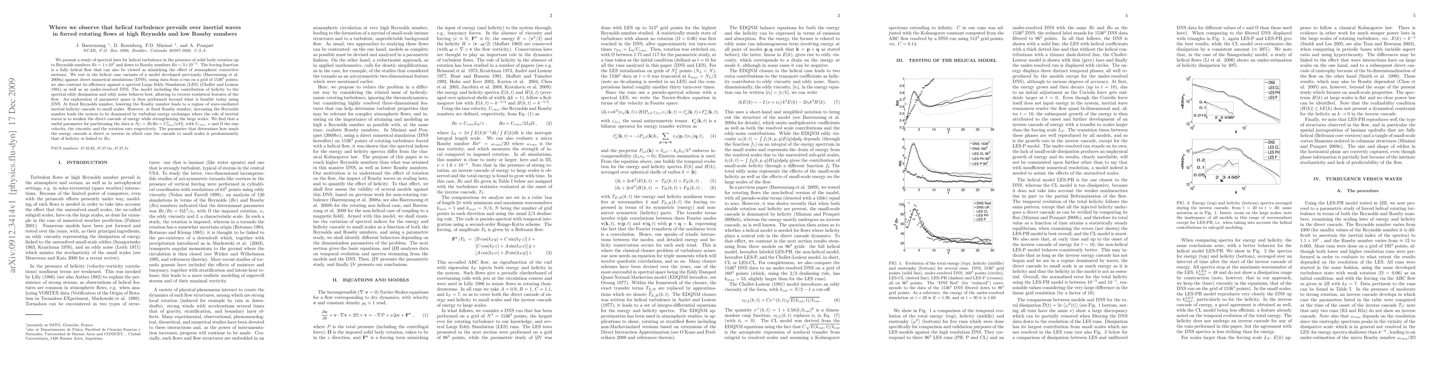 This study investigates helical turbulence in forced rotating flows at high Reynolds and low Rossby numbers, finding that helical turbulence dominates over inertial waves. The model developed for helical turbulence, including helicity contributions, best matches direct numerical simulations and shows that at high Reynolds numbers, turbulence prevails, while at low Rossby numbers, inertial waves influence the energy cascade.