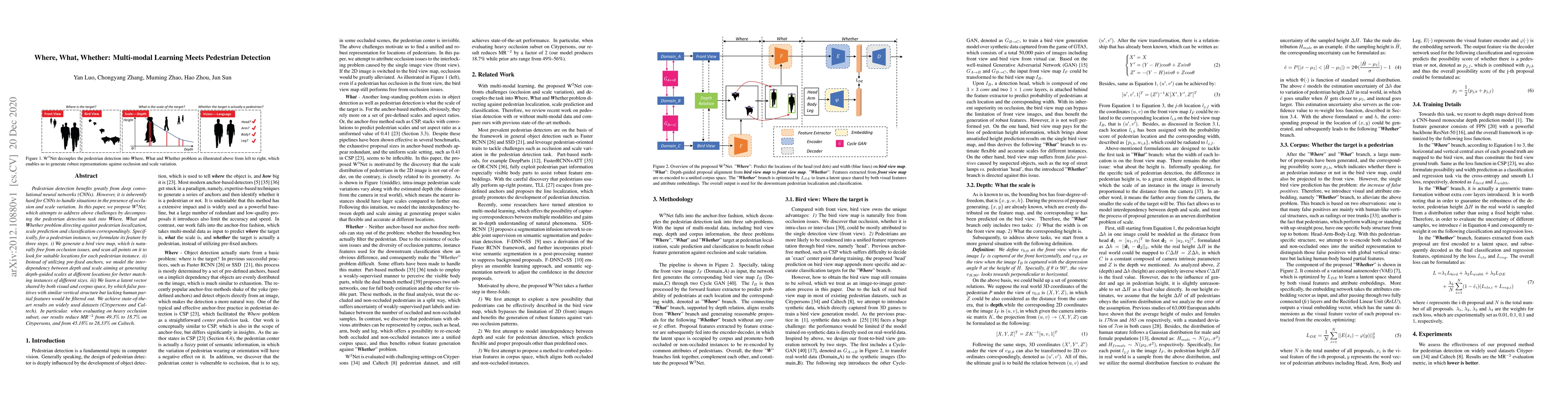 Pedestrian detection benefits greatly from deep convolutional neural networks (CNNs). However, it is inherently hard for CNNs to handle situations in the presence of occlusion and scale variation. In this paper, we propose W$^3$Net, which attempts to address above challenges by decomposing the pedestrian detection task into \textbf{\textit{W}}here, \textbf{\textit{W}}hat and \textbf{\textit{W}}hether problem directing against pedestrian localization, scale prediction and classification correspondingly. Specifically, for a pedestrian instance, we formulate its feature by three steps. i) We generate a bird view map, which is naturally free from occlusion issues, and scan all points on it to look for suitable locations for each pedestrian instance. ii) Instead of utilizing pre-fixed anchors, we model the interdependency between depth and scale aiming at generating depth-guided scales at different locations for better matching instances of different sizes. iii) We learn a latent vector shared by both visual and corpus space, by which false positives with similar vertical structure but lacking human partial features would be filtered out. We achieve state-of-the-art results on widely used datasets (Citypersons and Caltech). In particular. when evaluating on heavy occlusion subset, our results reduce MR$^{-2}$ from 49.3$\%$ to 18.7$\%$ on Citypersons, and from 45.18$\%$ to 28.33$\%$ on Caltech.