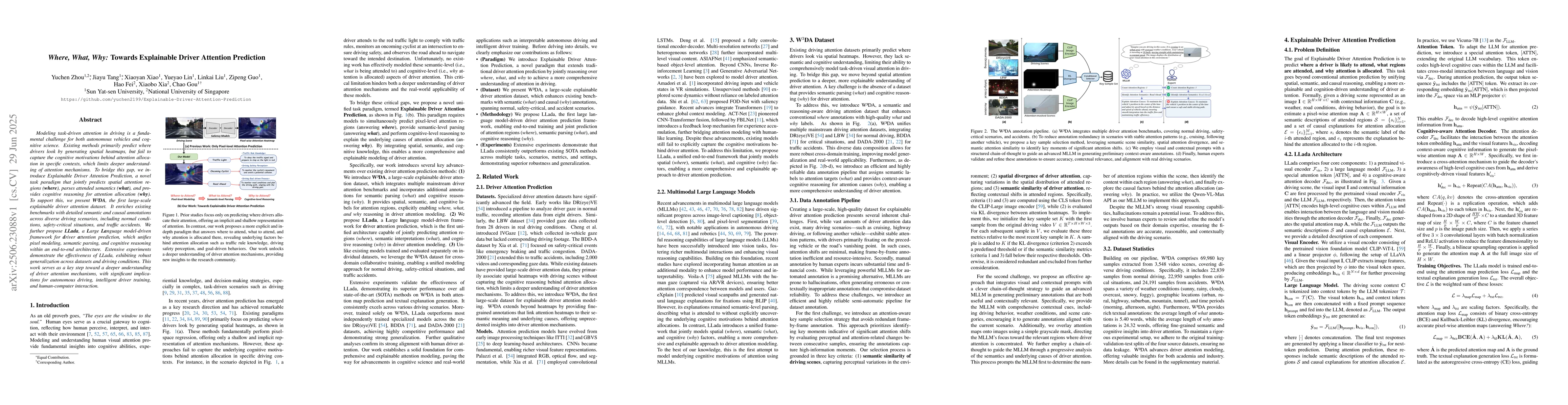 Modeling task-driven attention in driving is a fundamental challenge for both autonomous vehicles and cognitive science. Existing methods primarily predict where drivers look by generating spatial heatmaps, but fail to capture the cognitive motivations behind attention allocation in specific contexts, which limits deeper understanding of attention mechanisms. To bridge this gap, we introduce Explainable Driver Attention Prediction, a novel task paradigm that jointly predicts spatial attention regions (where), parses attended semantics (what), and provides cognitive reasoning for attention allocation (why). To support this, we present W3DA, the first large-scale explainable driver attention dataset. It enriches existing benchmarks with detailed semantic and causal annotations across diverse driving scenarios, including normal conditions, safety-critical situations, and traffic accidents. We further propose LLada, a Large Language model-driven framework for driver attention prediction, which unifies pixel modeling, semantic parsing, and cognitive reasoning within an end-to-end architecture. Extensive experiments demonstrate the effectiveness of LLada, exhibiting robust generalization across datasets and driving conditions. This work serves as a key step toward a deeper understanding of driver attention mechanisms, with significant implications for autonomous driving, intelligent driver training, and human-computer interaction.