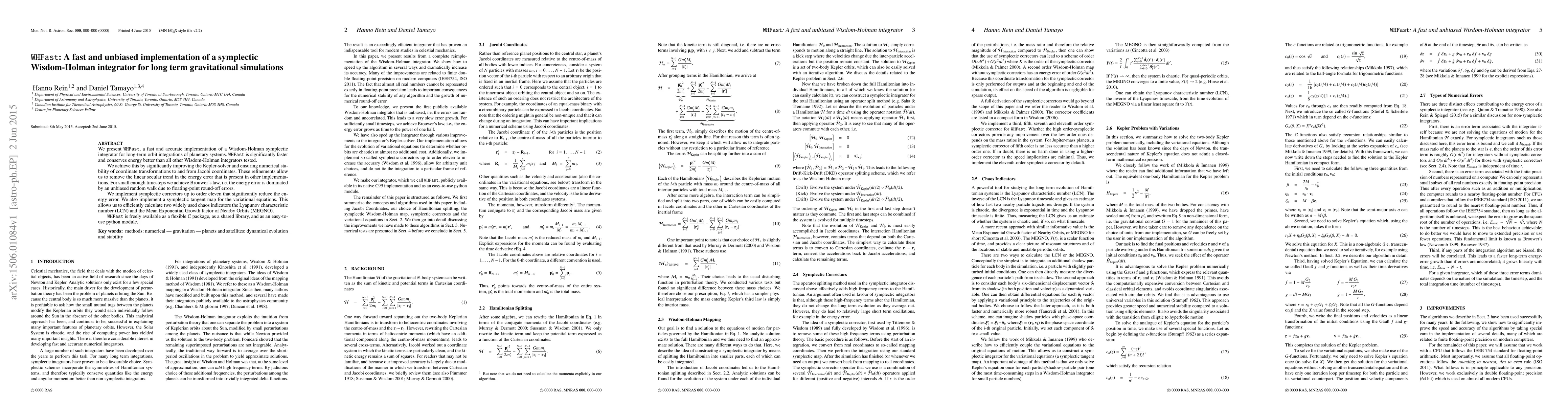 WHFast is a highly efficient implementation of the Wisdom-Holman symplectic integrator for long-term planetary simulations, offering superior speed and energy conservation compared to other methods. It achieves these improvements through refined Kepler-solver and stable coordinate transformations, enabling it to remove linear secular trends in energy error.