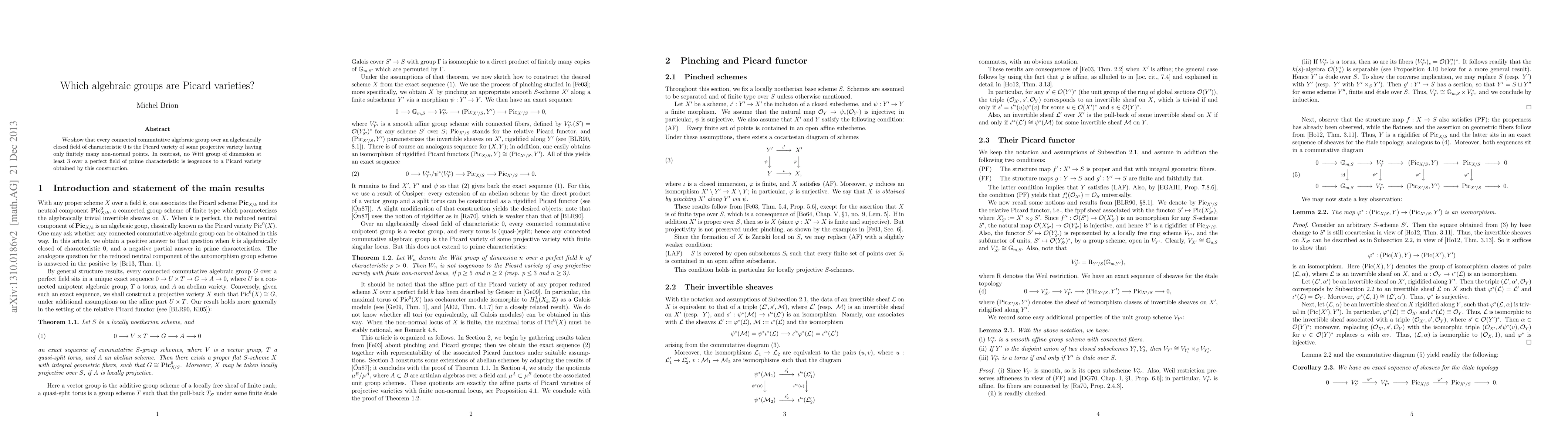 Researchers show that connected commutative algebraic groups over characteristic 0 fields can be represented as Picard varieties of projective varieties by pinching smooth varieties along finite schemes. However, this representation is not possible for Witt groups in dimensions at least 3 over perfect fields of prime characteristic.