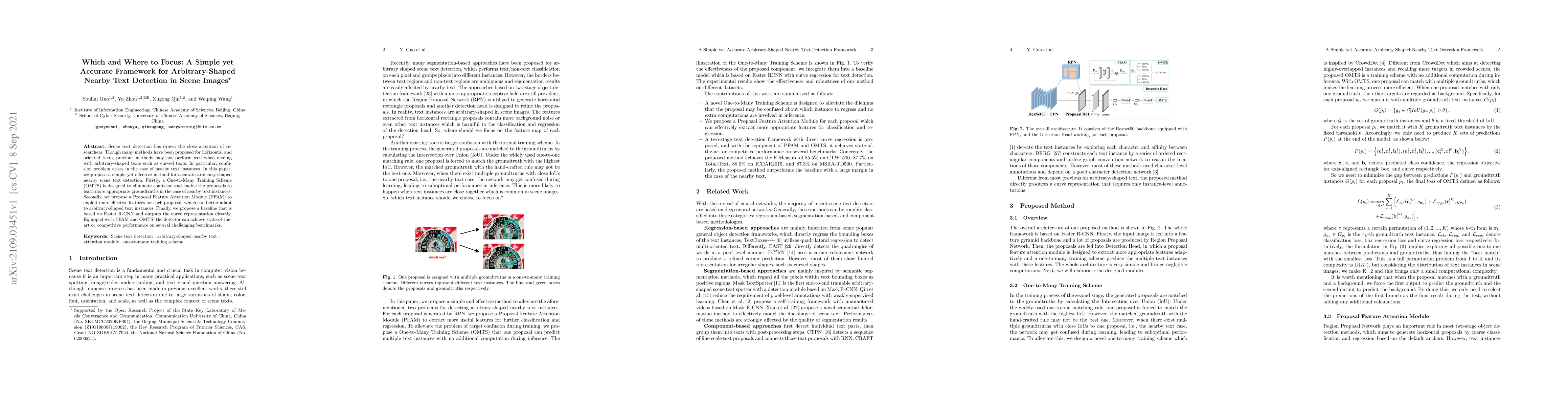 This paper proposes a framework for detecting arbitrary-shaped nearby text in scene images using a One-to-Many Training Scheme and a Proposal Feature Attention Module to enhance accuracy. The method, based on Faster R-CNN, achieves competitive performance on benchmarks.