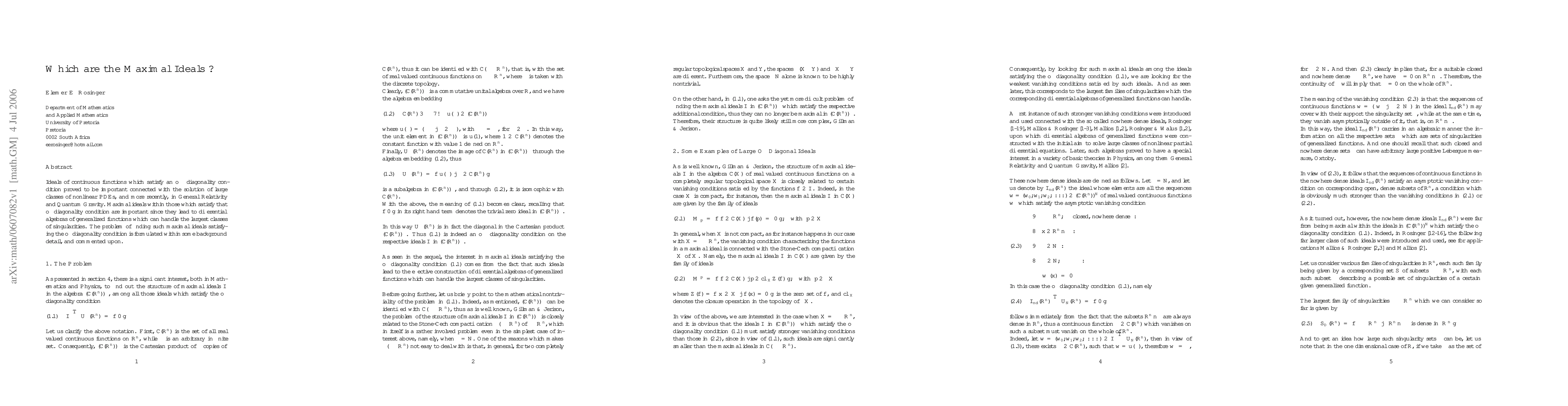 Ideals of continuous functions which satisfy an off diagonality condition proved to be important connected with the solution of large classes of nonlinear PDEs, and more recently, in General Relativity and Quantum Gravity. Maximal ideals within those which satisfy that off diagonality condition are important since they lead to differential algebras of generalized functions which can handle the largest classes of singularities. The problem of finding such maximal ideals satisfying the off diagonality condition is formulated within some background detail, and commented upon.