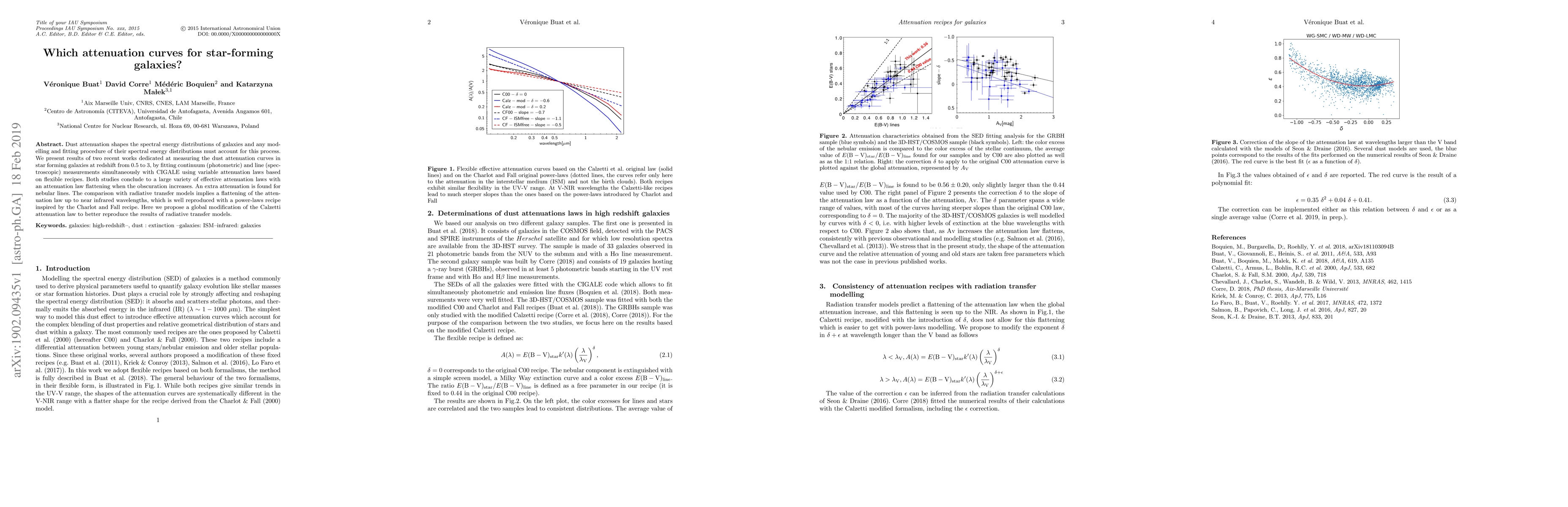 Dust attenuation shapes the spectral energy distributions of galaxies and any modelling and fitting procedure of their spectral energy distributions must account for this process. We present results of two recent works dedicated at measuring the dust attenuation curves in star forming galaxies at redshift from 0.5 to 3, by fitting continuum (photometric) and line (spectroscopic) measurements simultaneously with CIGALE using variable attenuation laws based on flexible recipes. Both studies conclude to a large variety of effective attenuation laws with an attenuation law flattening when the obscuration increases. An extra attenuation is found for nebular lines. The comparison with radiative transfer models implies a flattening of the attenuation law up to near infrared wavelengths, which is well reproduced with a power-laws recipe inspired by the Charlot and Fall recipe. Here we propose a global modification of the Calzetti attenuation law to better reproduce the results of radiative transfer models.