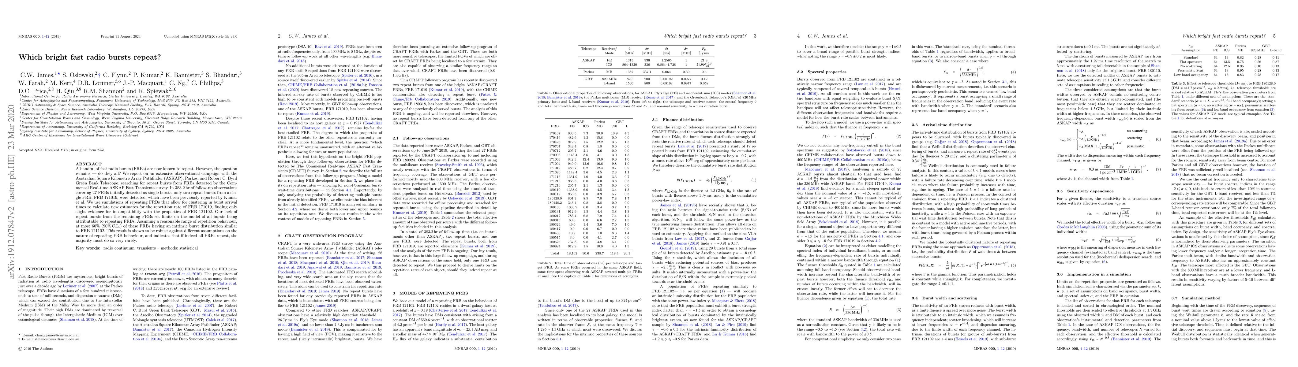This study reports on an extensive observational campaign to detect repeat bursts from 27 fast radio bursts (FRBs), finding only two repeat bursts from FRB 171019. The results suggest that at most 60% of FRBs may have an intrinsic burst distribution similar to FRB 121102, indicating that most FRBs, if they repeat, do so very rarely.