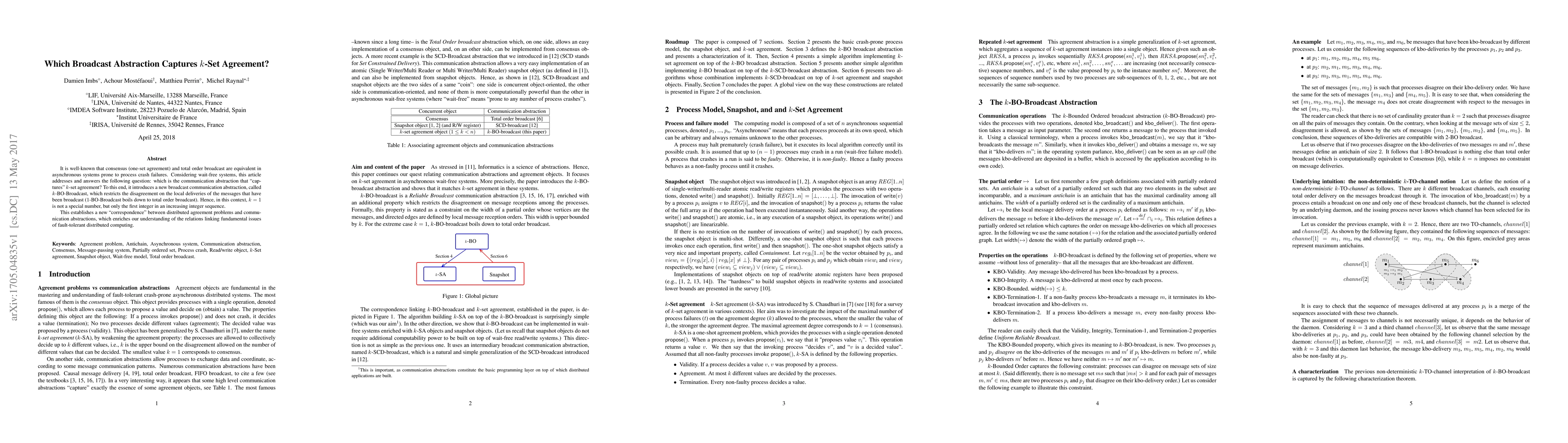 It is well-known that consensus (one-set agreement) and total order broadcast are equivalent in asynchronous systems prone to process crash failures. Considering wait-free systems, this article addresses and answers the following question: which is the communication abstraction that "captures" $k$-set agreement? To this end, it introduces a new broadcast communication abstraction, called $k$-BO-Broadcast, which restricts the disagreement on the local deliveries of the messages that have been broadcast ($1$-BO-Broadcast boils down to total order broadcast). Hence, in this context, $k=1$ is not a special number, but only the first integer in an increasing integer sequence. This establishes a new "correspondence" between distributed agreement problems and communication abstractions, which enriches our understanding of the relations linking fundamental issues of fault-tolerant distributed computing.