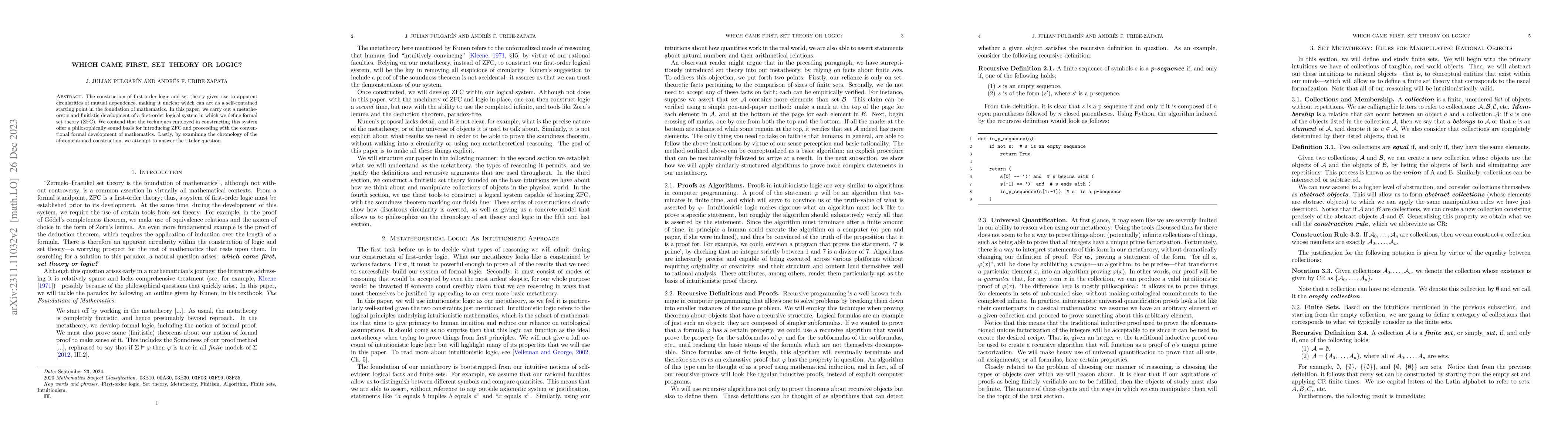 This paper explores the foundational relationship between first-order logic and set theory, proposing that a metatheoretic development of first-order logic can introduce and justify Zermelo-Fraenkel set theory (ZFC). It concludes by examining the historical construction to determine which came first.