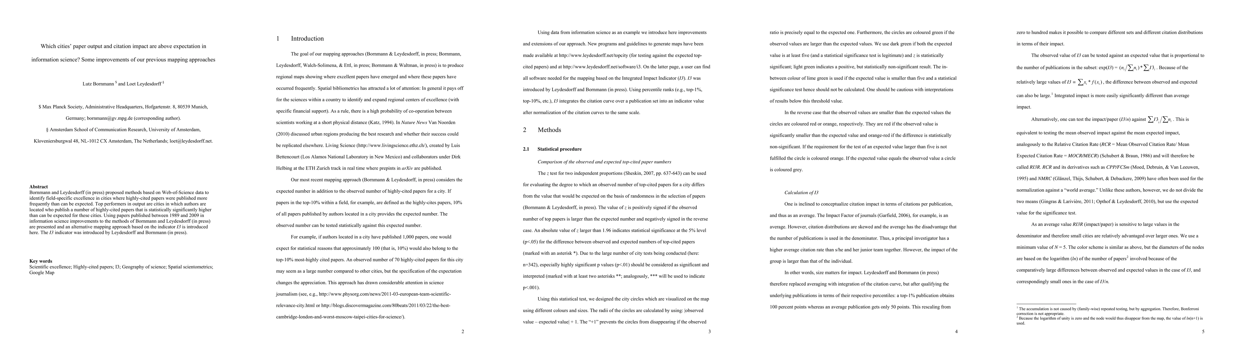 Bornmann and Leydesdorff (in press) proposed methods based on Web-of-Science data to identify field-specific excellence in cities where highly-cited papers were published more frequently than can be expected. Top performers in output are cities in which authors are located who publish a number of highly-cited papers that is statistically significantly higher than can be expected for these cities. Using papers published between 1989 and 2009 in information science improvements to the methods of Bornmann and Leydesdorff (in press) are presented and an alternative mapping approach based on the indicator I3 is introduced here. The I3 indicator was introduced by Leydesdorff and Bornmann (in press).