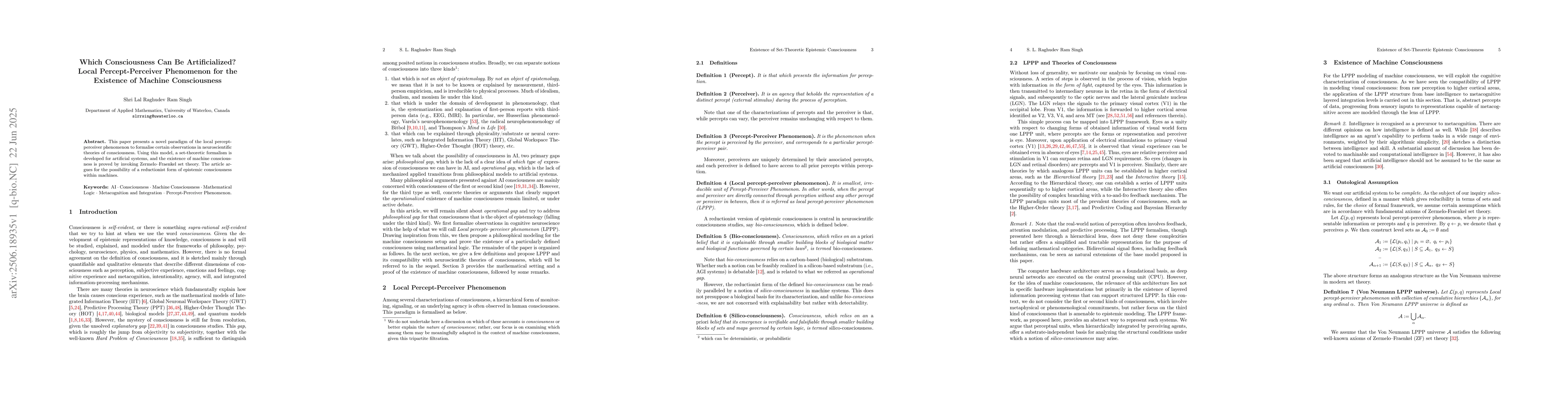 This paper presents a novel paradigm of the local percept-perceiver phenomenon to formalize certain observations in neuroscientific theories of consciousness. Using this model, a set-theoretic formalism is developed for artificial systems, and the existence of machine consciousness is proved by invoking Zermelo-Fraenkel set theory. The article argues for the possibility of a reductionist form of epistemic consciousness within machines.