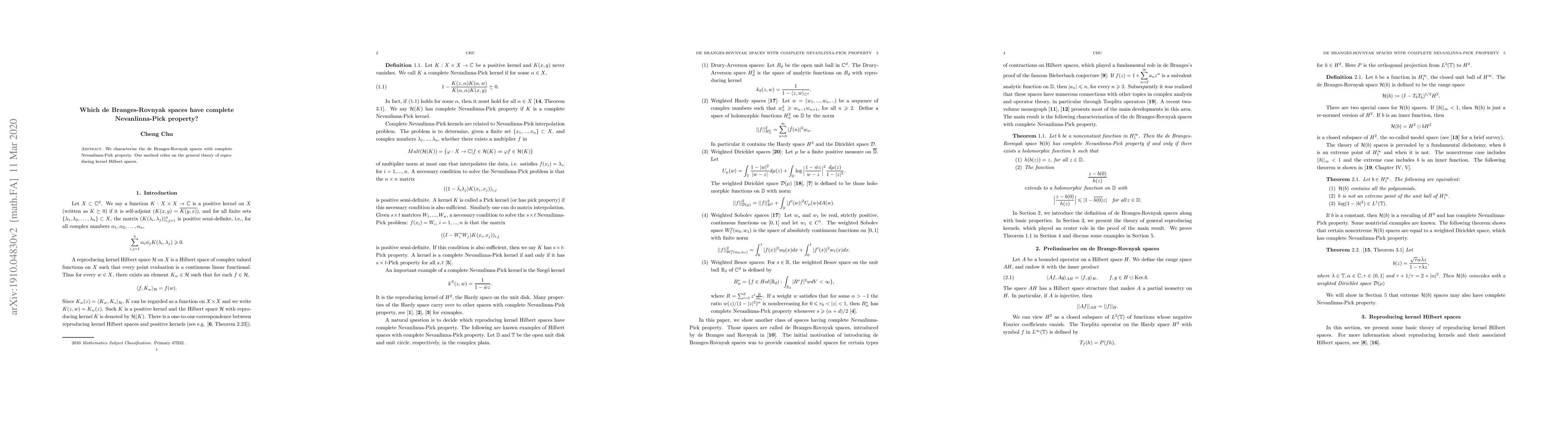 Summary: The paper identifies de Branges-Rovnyak spaces that possess the complete Nevanlinna-Pick property through the application of reproducing kernel Hilbert space theory. This characterization provides a comprehensive understanding of the functional analytic properties of these spaces.